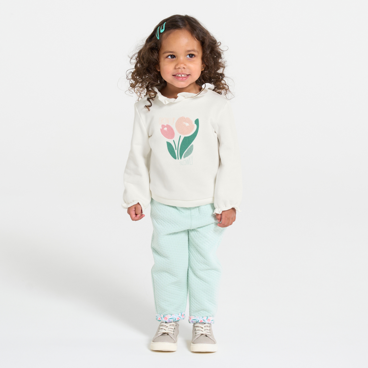 سويت شيرت من الصوف الناعم بياقة متموجة، مزينة برسوم الزهور، باللون الأبيض للفتيات الصغيرات
