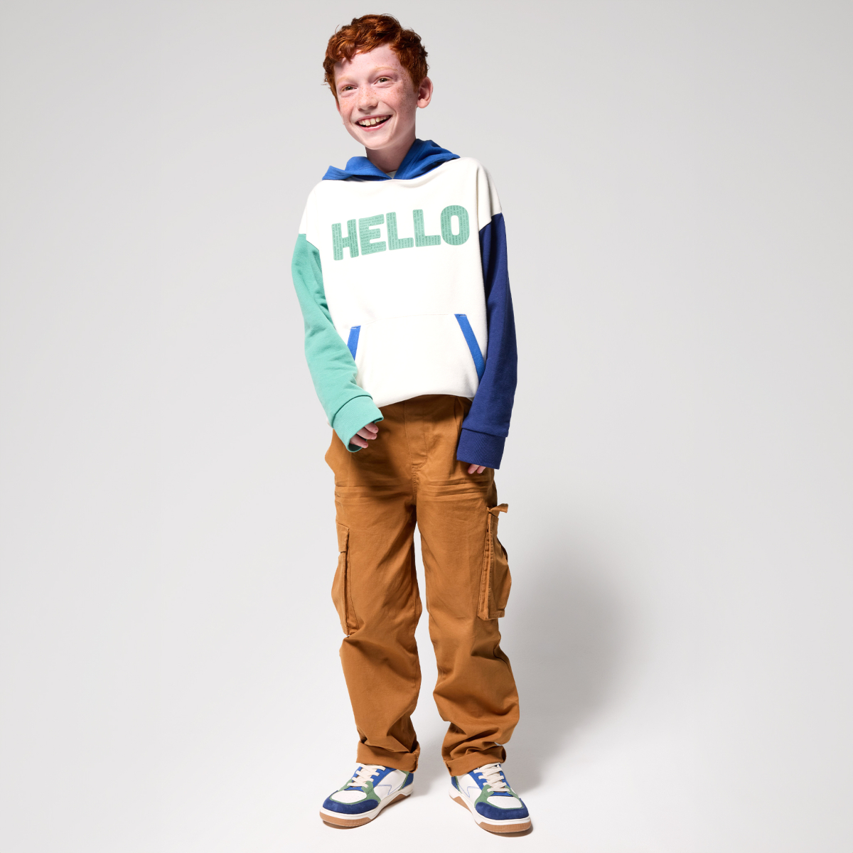 سُترة سويت شيرت بالألوان للفتيان تجمع بين الأناقة والراحة بفضل القصة الفضفاض. مصنوعة من الميلتون الناعم، وتبرُز عليها رسالة "HELLO" بحروف متباينة، كما تتمايز بأكمام يزينها كتلة ألوان، بالأخضر وبالأسود. سُترة تي شيرت عملية للحياة اليومية، حيث لديها غطاء للرأس للوقاية، وجيب شبيه بجيب الكنغر للحفاظ على دفء اليدين. سهل الارتداء ومثالي للذهاب إلى مختلف المغامرات.