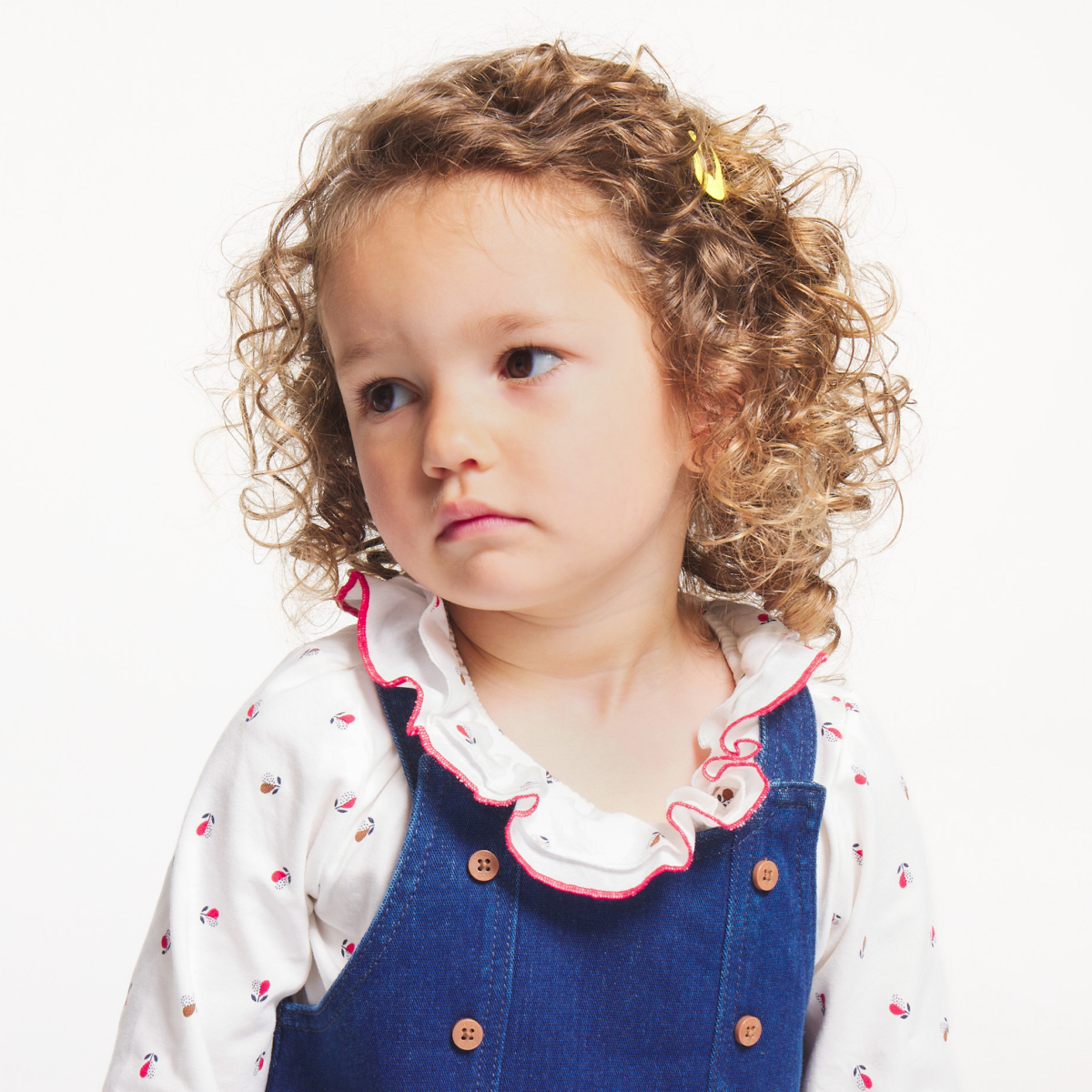 وصفي لإطلالة رومانسية للصغار، تيشيرت بتفاصيل راقية: قطن ناعم على البشرة، ياقة بيرو فاخرة ونمط ساحر. أكمام طويلة مطاطية مع خياطة متباينة.