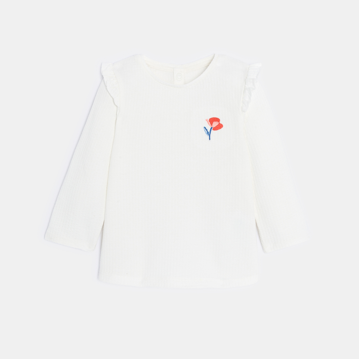 وصفي الصغيرات يحبون هذا التيشيرت، تصميم يوفر كل التفاصيل التي تروق للفتيات! يحب عشاق الموضة التفاصيل المميزة: أكمام طويلة مكشكشة، قطن فاخر بتأثير الوافل وزهرة مطرزة جميلة. أزرار كبس على الظهر لسهولة الارتداء.