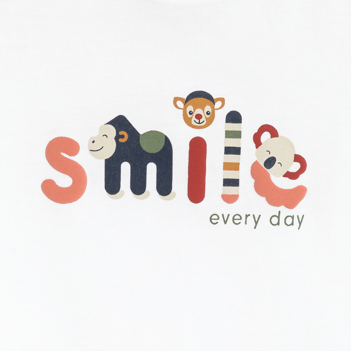 تبتسم الحيوانات على هذا التيشيرت لتضفي لمسة مرحة ويتعلم منها الصغار شكل الحروف الأبجدية! يأتي التيشيرت من القطن الناعم بأكمام قصيرة وأزرار كبس على الكتف لسهولة مرور رأس الصغير.