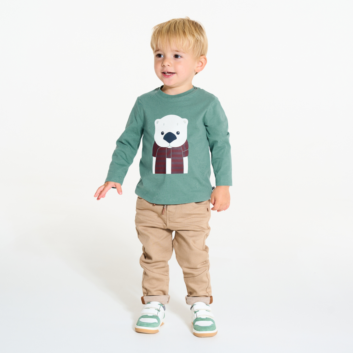 تيشيرت بأكمام طويلة برسمة دب باللون الأخضر للأولاد الصغار