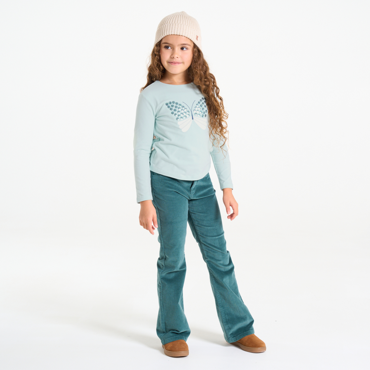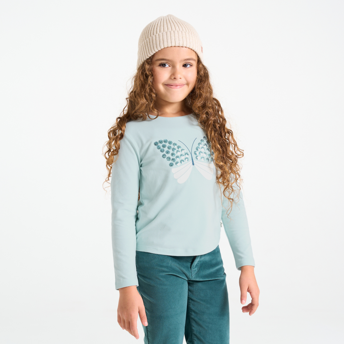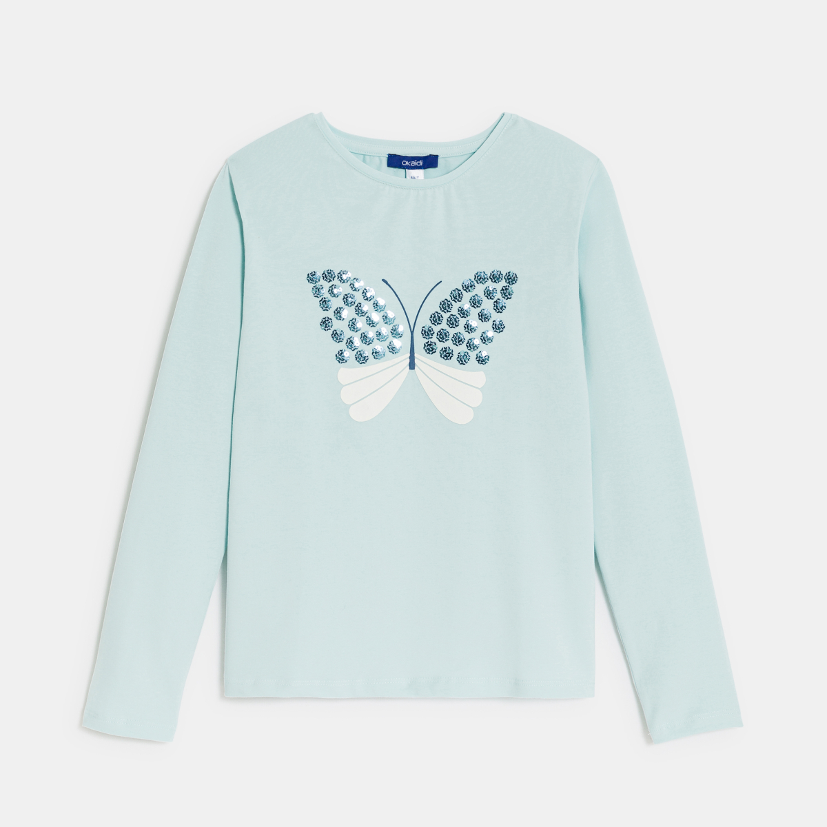الترتر المطرز على الفراشة الكبيرة المطبوعة يضفي مزيدا من التألق على هذا التيشرت ذو الأكمام الطويلة! جيرسي ناعم وممتع في الارتداء. قصّة مستقيمة. رقبة مستديرة. أكمام طويلة. الحافة السفلية مستقيمة. خياطة بنفس اللون.