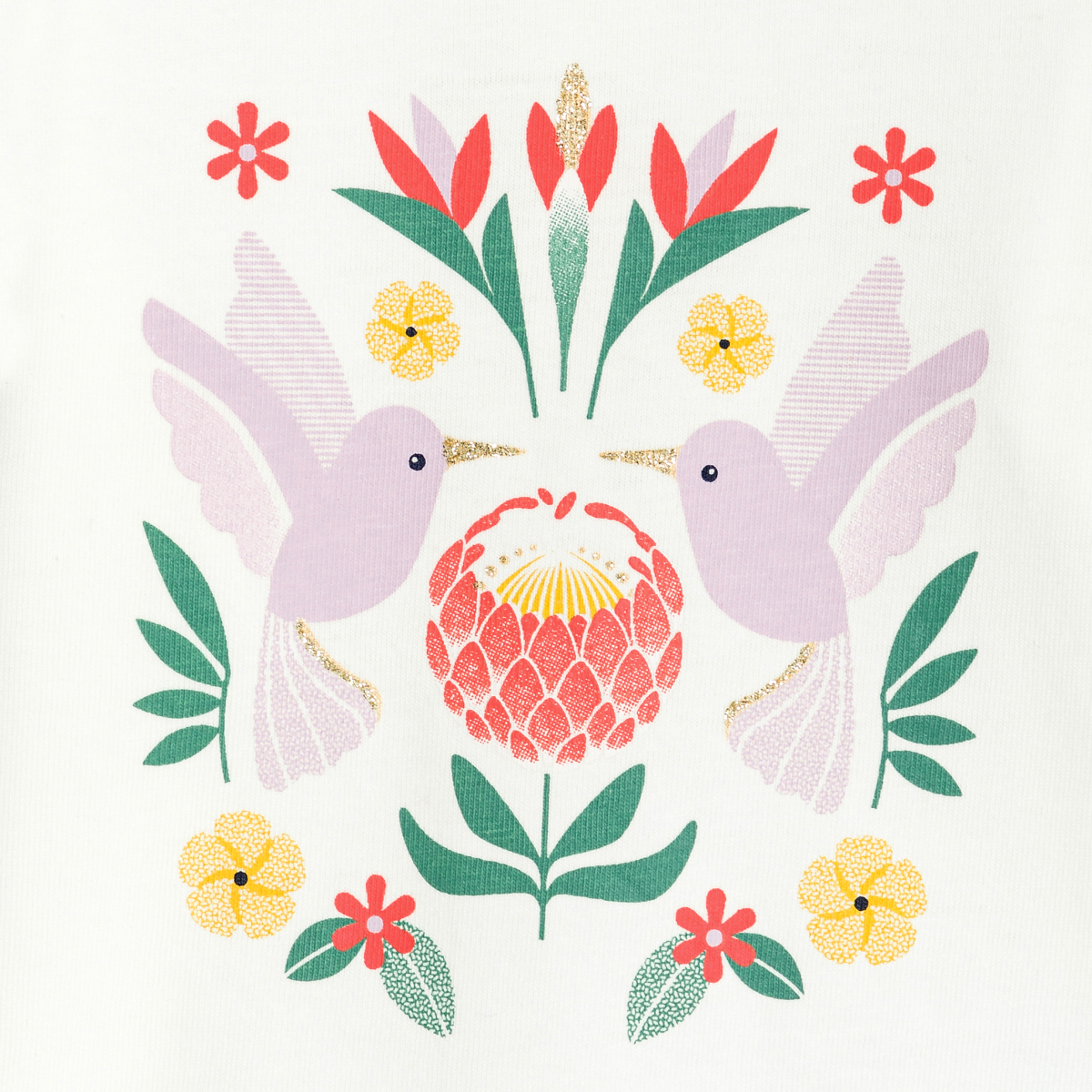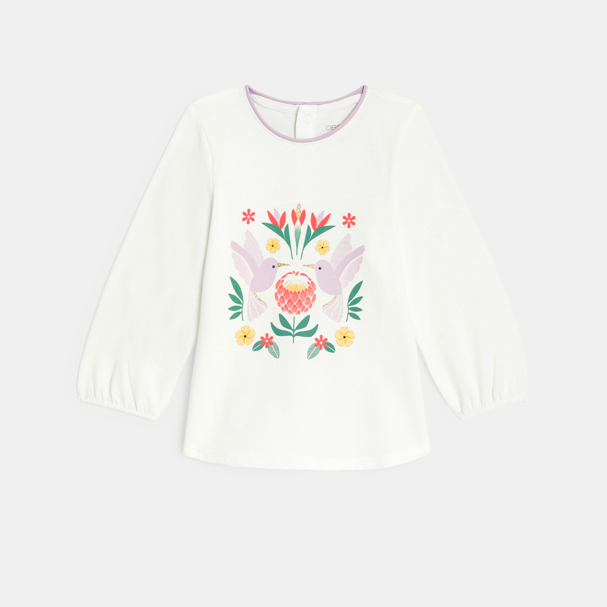 تيشيرت بأكمام طويلة من القطني، مزين برسوم الطيور، باللون الأبيض للفتيات الصغيرات