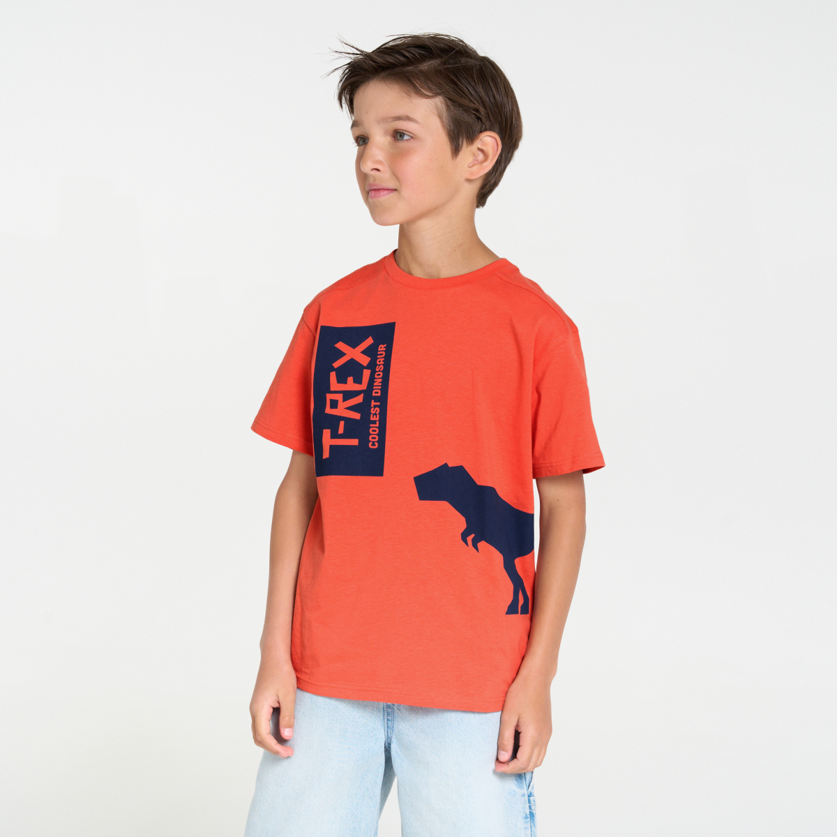 تيشيرت بأكمام قصيرة، مُزيّن برسمة ديناصور، باللون البرتقالي للفتيان