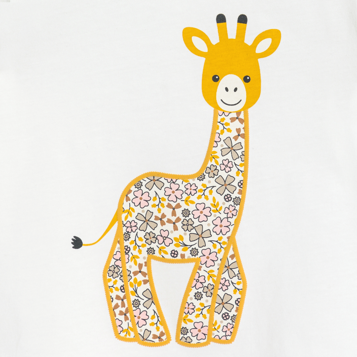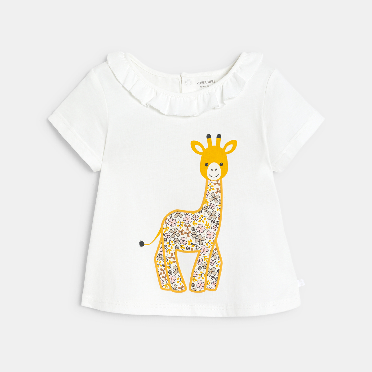 تيشيرت أبيض بياقة متموجة برسمة زرافة للفتيات الصغيرات