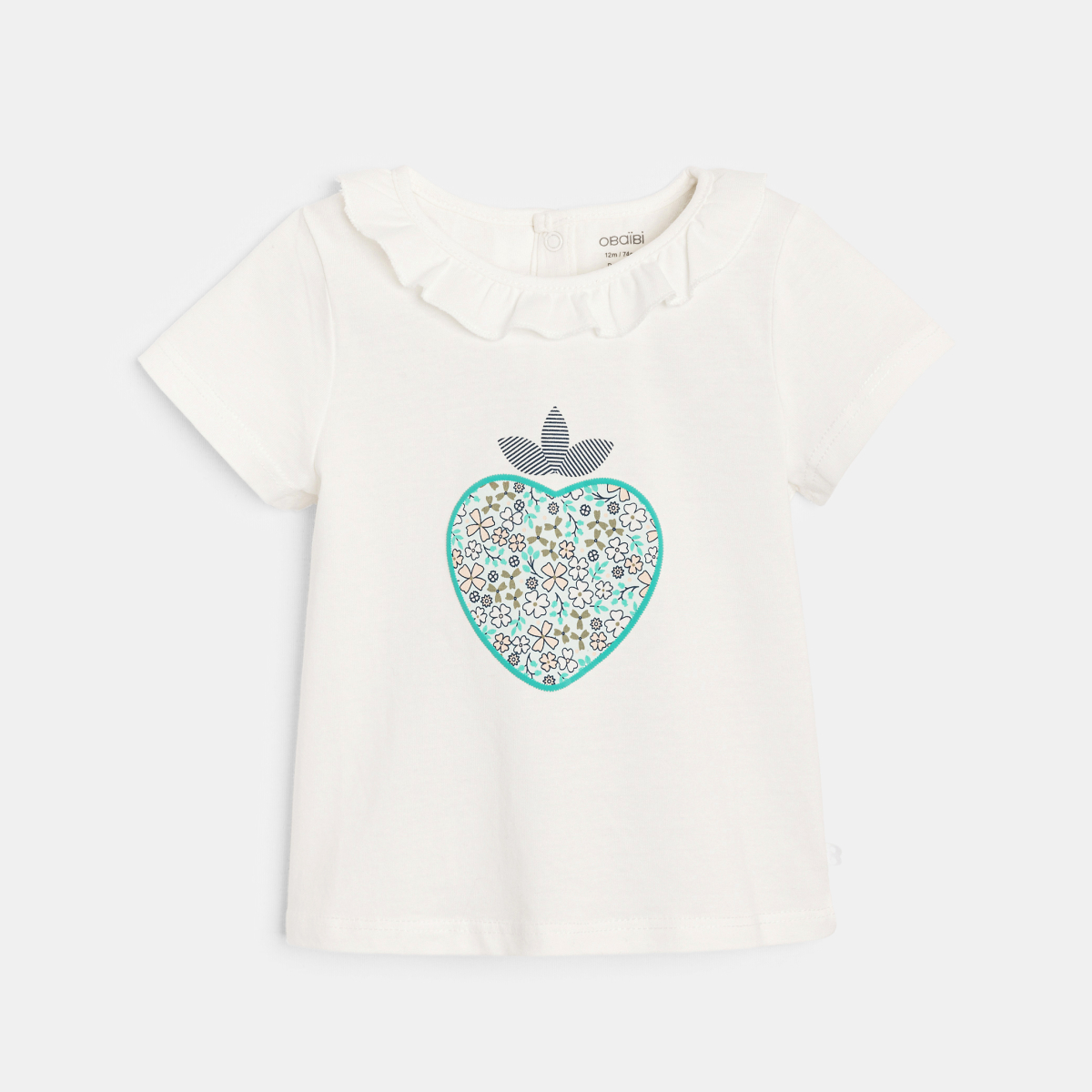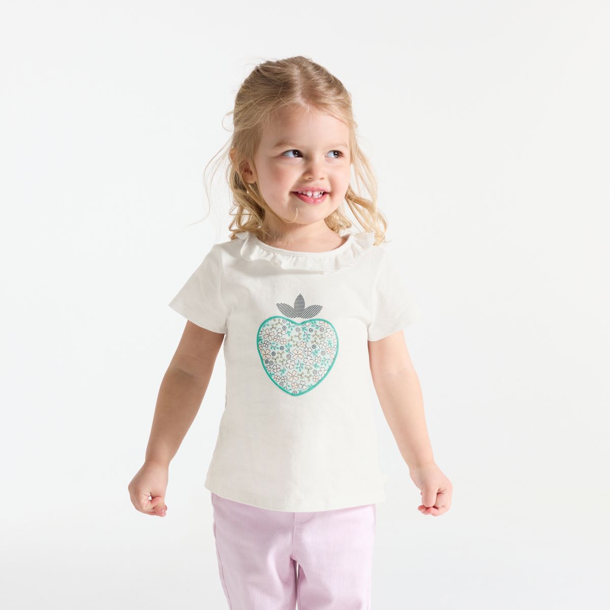تيشيرت أبيض وعليه رسمة قلب، بياقة مكشكشة، للفتيات الصغيرات