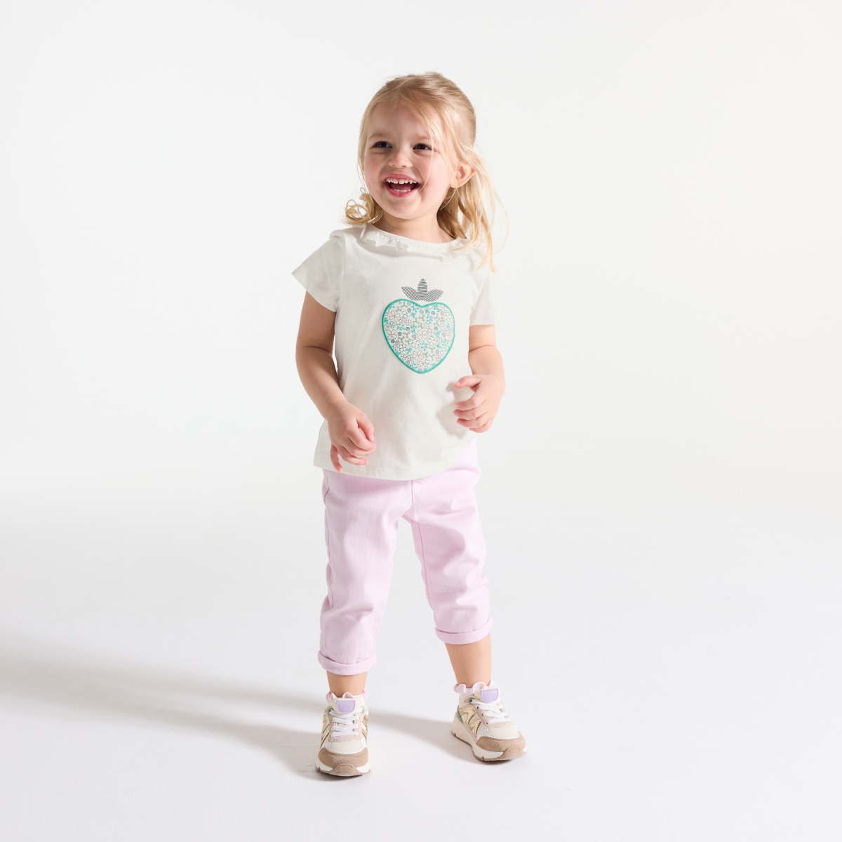 وصفي الفتيات الصغيرات، العاشقة للطبيعة، تُعجب كثيرًا بالرسوم المُبهجة التي تُزيِّن التيشيرت : رسمة قلب منقوشة بالزهور تضفي البهجة على مظهرهن ! تيشيرت بأكمام قصيرة وواسعة قليلاً، مع ياقة مُكشكشة، يُفتح بأزرار كبس من الخلف.
