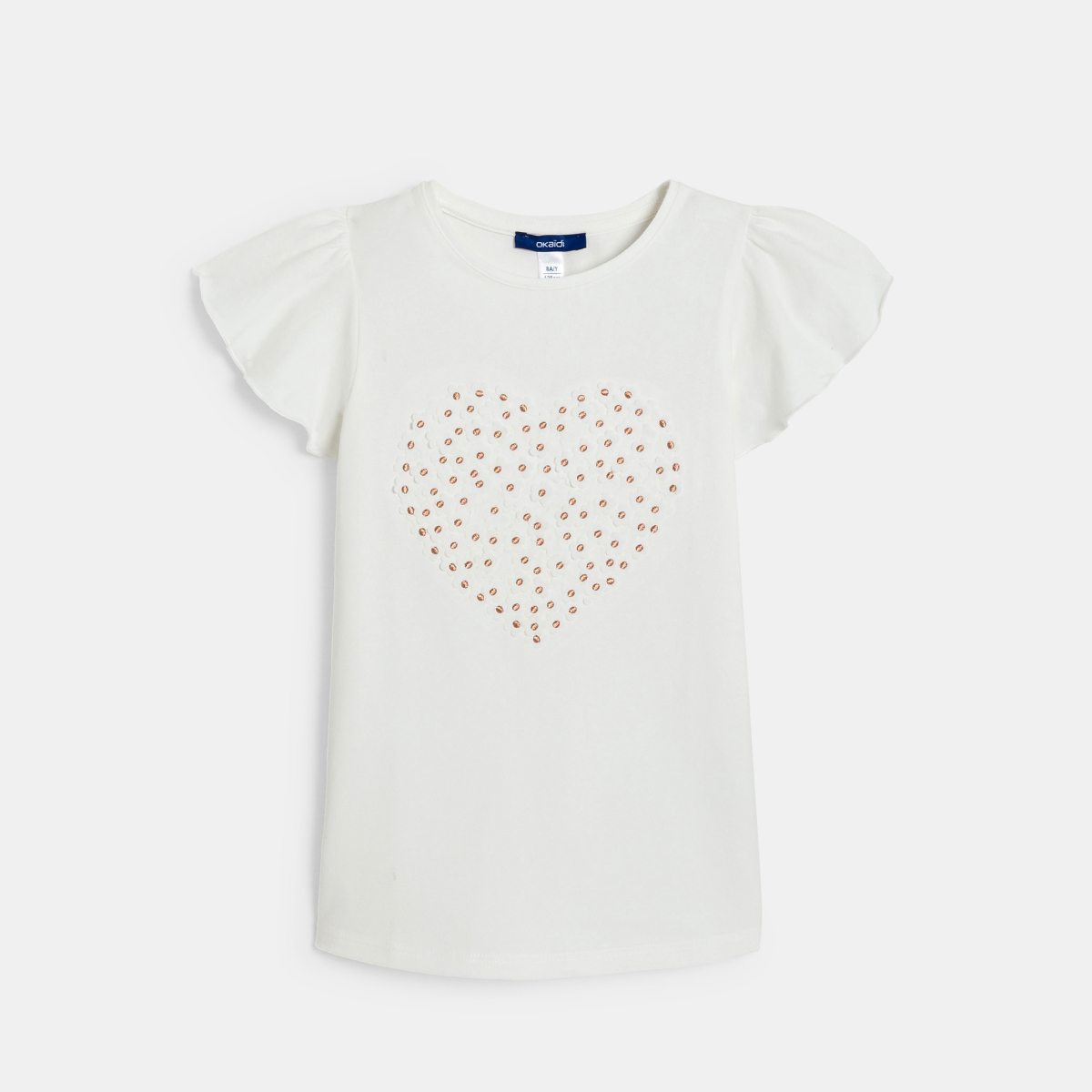 تيشيرت بأكمام فراشة ورسمة قلب، باللون الأبيض للفتيات