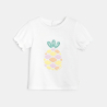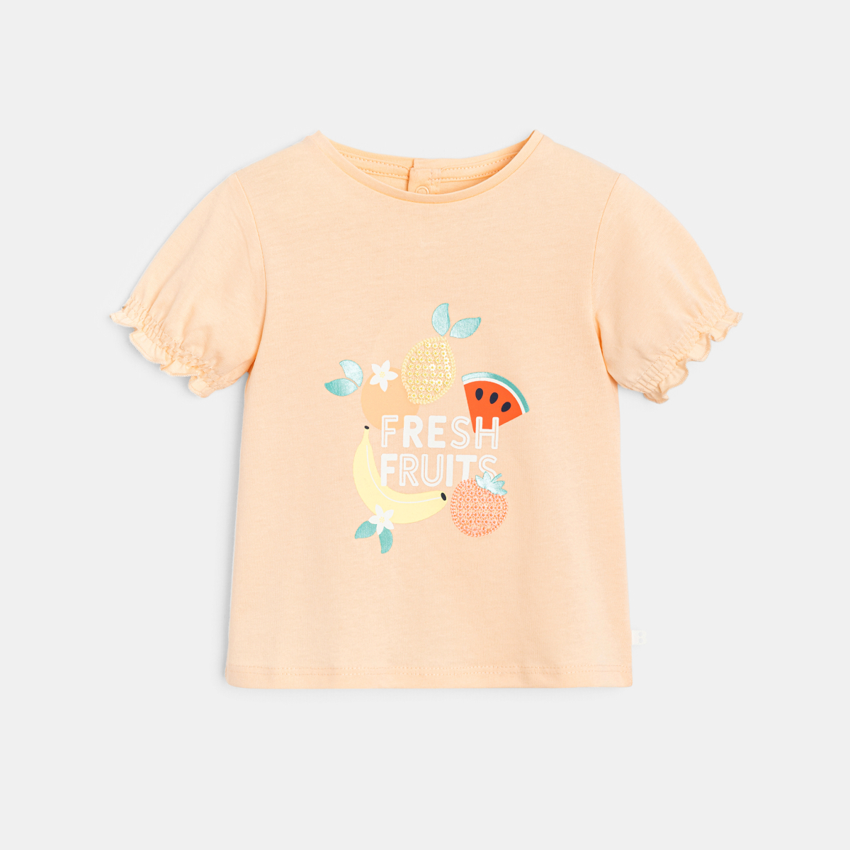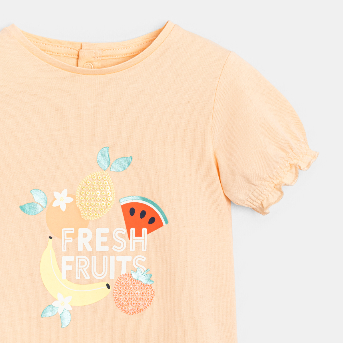 وصفي يحب الصغار التأثير الرسومي للفواكه المطرزة عليه بالترتر! تيشيرت بلمسة أصلية وأكمام قصيرة بكشكشة مجمعة ومرنة. رقبة مستديرة مع أزرار كبس في الخلف لسهولة مرور رأس الصغير.
