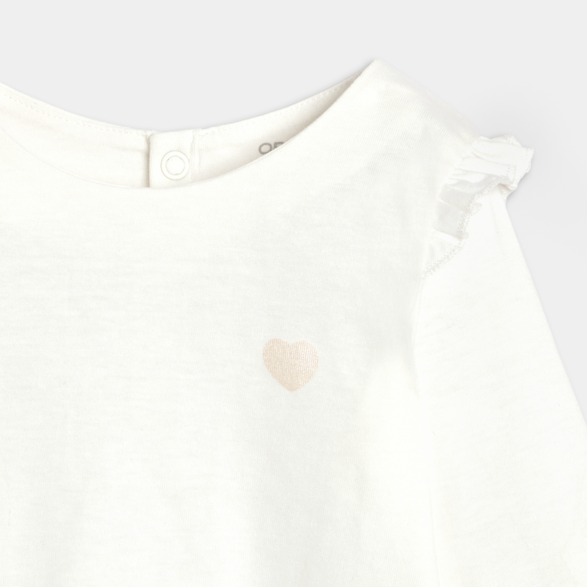 إطلالة رومانسية لتيشيرت أصلي ترتديه الصغيرات طوال الموسم. يتميز بأكمامه الطويلة وأكتافه المكشكشة التي توفر الراحة والنعومة للصغيرات اللاتي يقدرن لمسة ألوان الباستيل. الغلق بأزرار ضغط على الظهر لسهولة الارتداء.