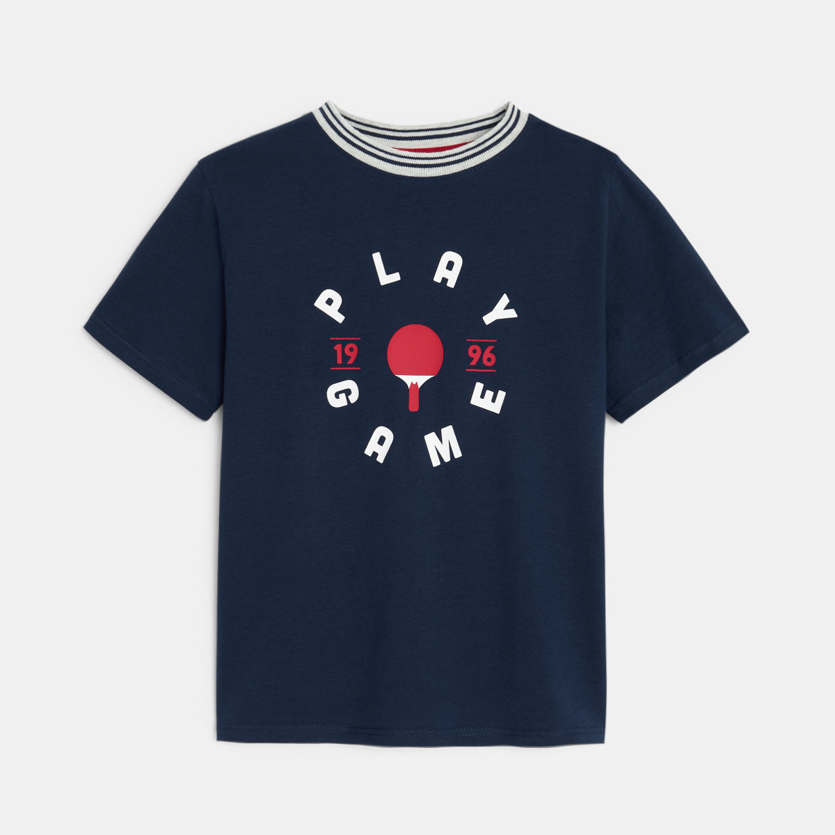 تيشيرت بأكمام قصيرة، باللون الأزرق ومُزيَّن برسالة مطبوعة، للفتيان
