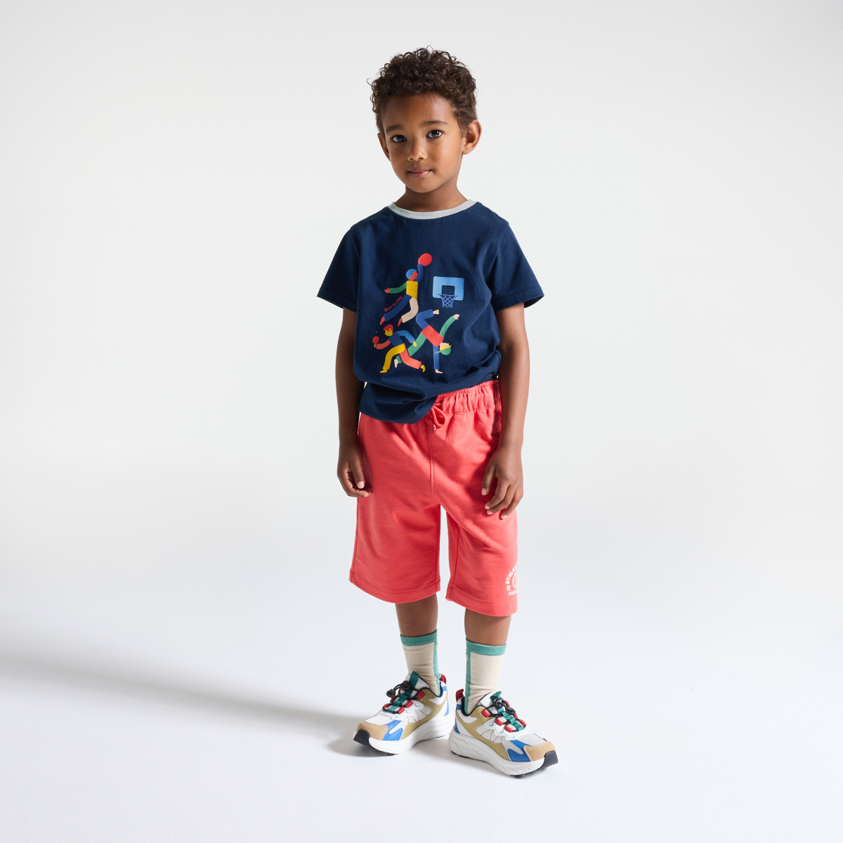 النقوش الملونة هي سر حيوية إطلالات الأولاد هذا الموسم! قماش جيرسي من القطن الناعم. قصّة مستقيمة. رقبة مستديرة بلون مختلف. رسمة مطبوعة جهة الأمام وبدون نقوش بالخلف. أكمام قصيرة. الحافة السفلية مستقيمة. خياطة من اللون ذاته.