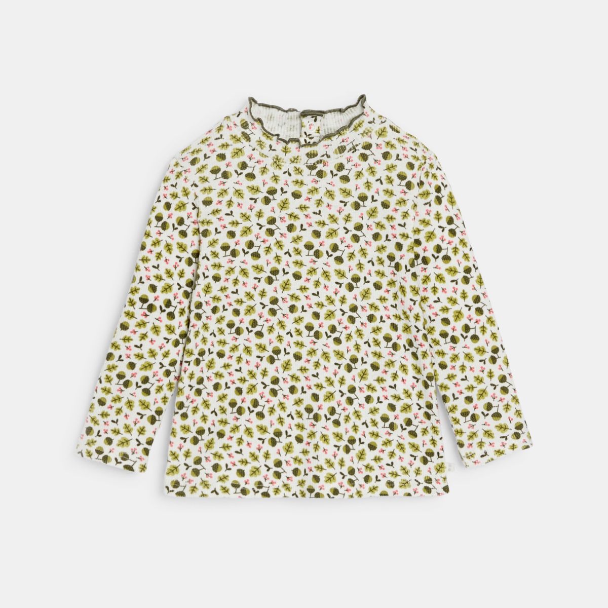 يتميز هذا التيشيرت، ذو الأكمام الطويلة، بمرونة النسيج الصوفي المضلع والدقيق. منمق برسوم أزهار مطبوعة ستروق للفتيات الصغيرات. الأطراف مطوية والياقة متموجة. الإغلاق بـثلاثة أزرار كبس خلفية.