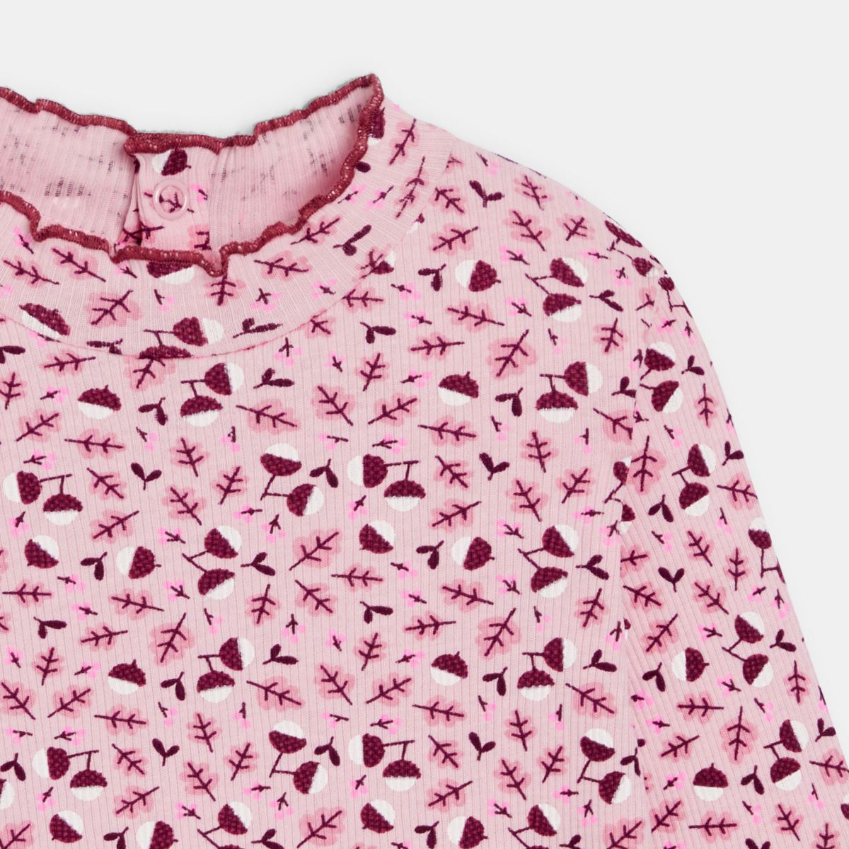 يتميز هذا التيشيرت، ذو الأكمام الطويلة، بمرونة النسيج الصوفي المضلع والدقيق. منمق برسوم أزهار مطبوعة ستروق للفتيات الصغيرات. الأطراف مطوية والياقة متموجة. الإغلاق بـثلاثة أزرار كبس خلفية.