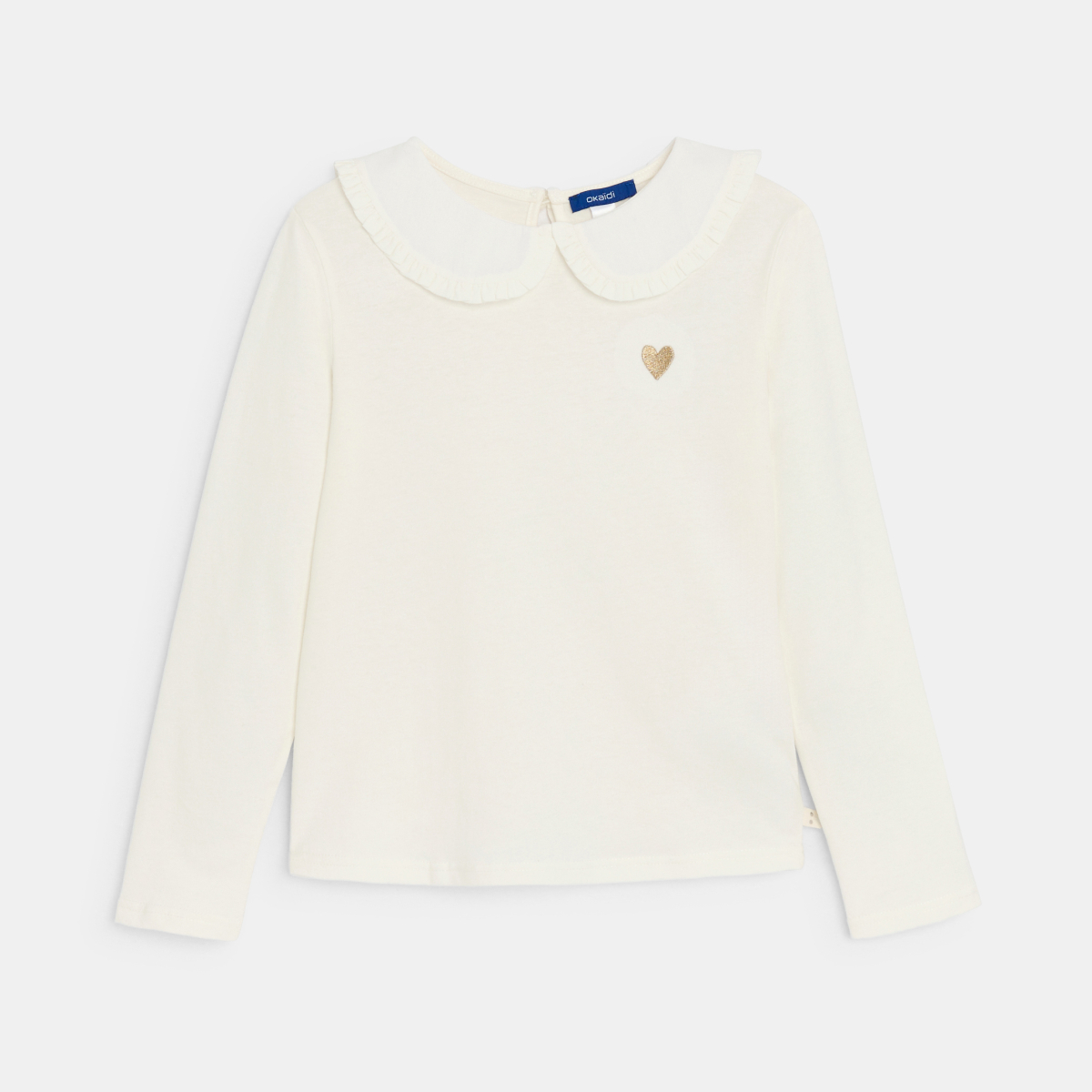 تيشيرت بأكمام طويلة وياقة كلودين، باللون الأبيض، للفتيات