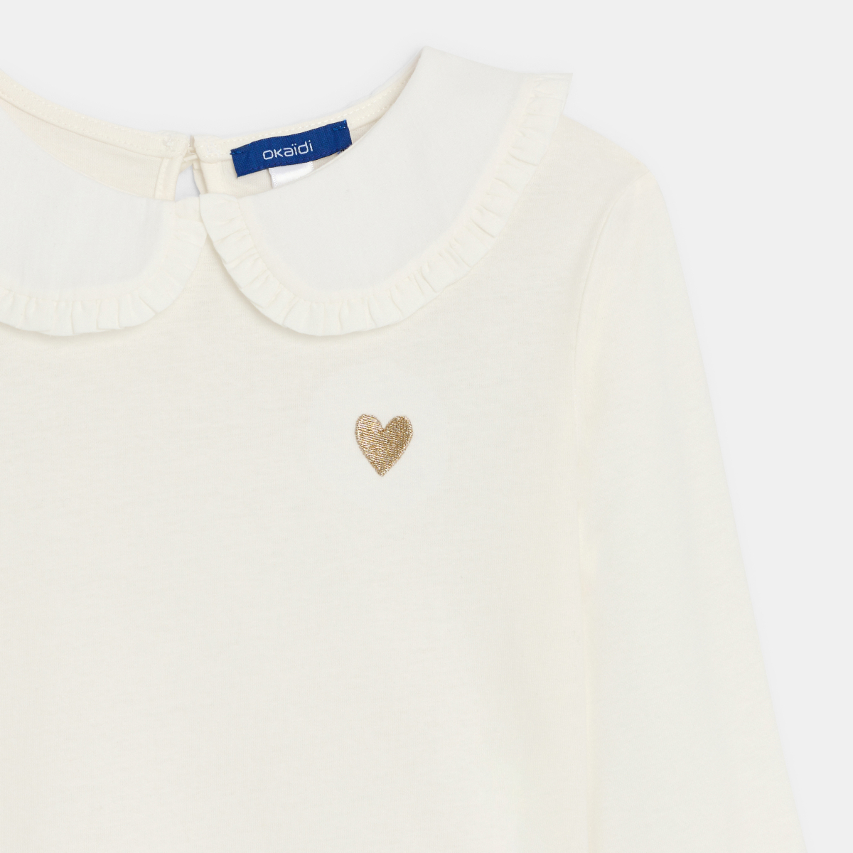 وصفي لمسة من الأناقة، لمسة من الموضة القديمة! يحتوي هذا التيشيرت من الجيرسيه الناعم على كل شيء: ياقة كلودين مزينة بكشكشة، تقويرة دمعة بأزرار من الخلف لسهولة الارتداء وقلب مطرز بخيط ذهبي على الصدر. قصّة مستقيمة. أكمام طويلة. الحافة السفلية مستقيمة. خياطة من اللون ذاته.