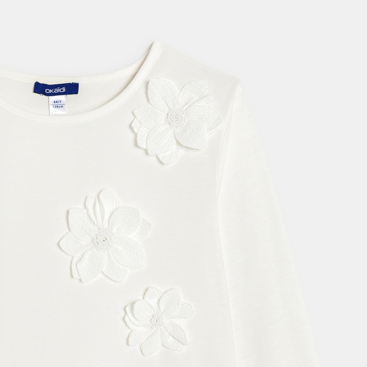 تيشيرت بأكمام طويلة، باللون الأبيض، مُزيَّن بالزهور، للفتيات