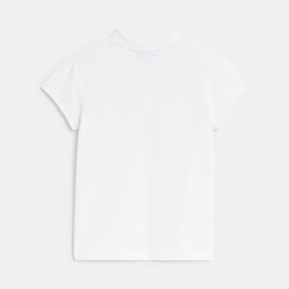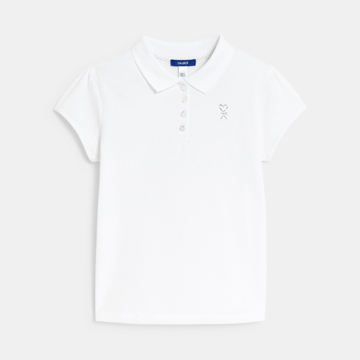 وصفي تي شيرت/بلوزة بناتي. قماش جيرسي قطني منسوج. قَصّة ضيقة. ياقة بولو مع فتحة بأزرار سهلة الارتداء. شعار Obaïbi بالبرّيق كسرات ناعمة في أعلى الأكمام القصيرة جدًا مع شريط على الحواف. الحاشية السفلية مستقيمة. نهايات مدروزة بعناية فائقة.