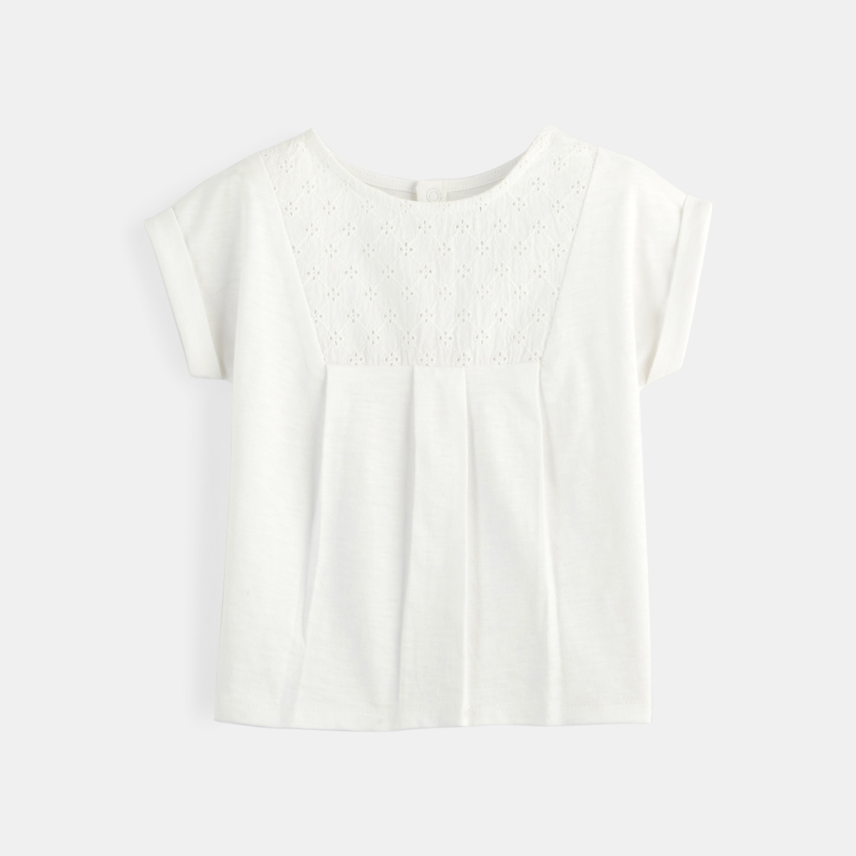 تي شيرت بأكمام قصيرة بناتي بي بي. قماش جيرسي وتطريز إنجليزي على الياقة الدائرية. ألياف قطنية من الزراعة العضوية والملتزمة،Act for Kids. ياقة دائرية واسعة مع كبسات في الخلف لسهولة الارتداء. أكمام قصيرة مطرقة مع طية مدروزة. مجموعة من الطيات تحت القطعة المطرزة في الأمام. لصاقة صغيرة أوبي بي في الداخل.