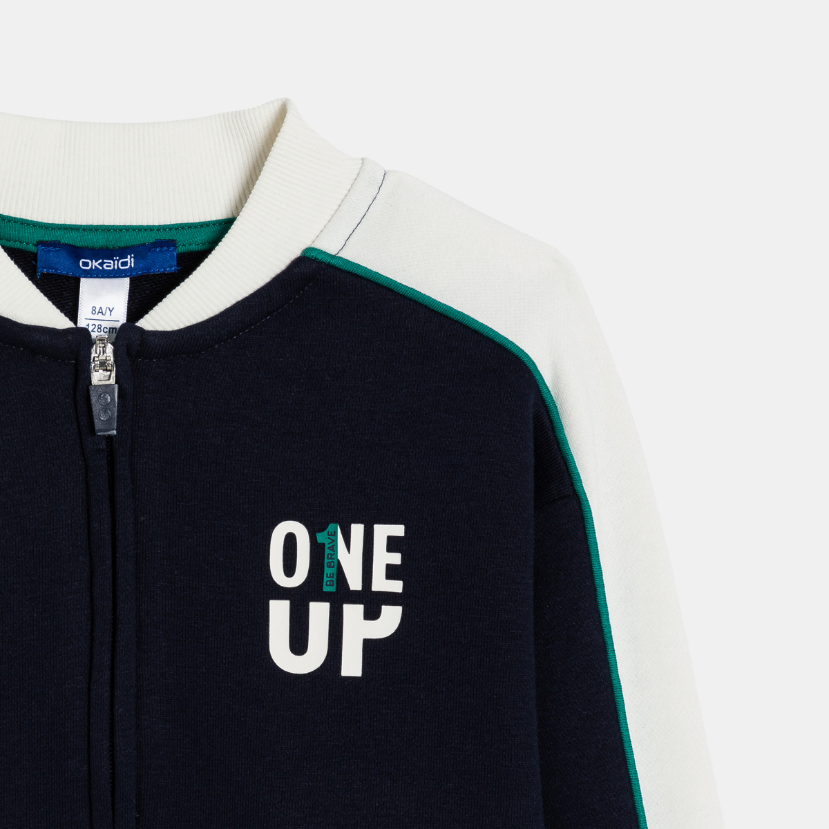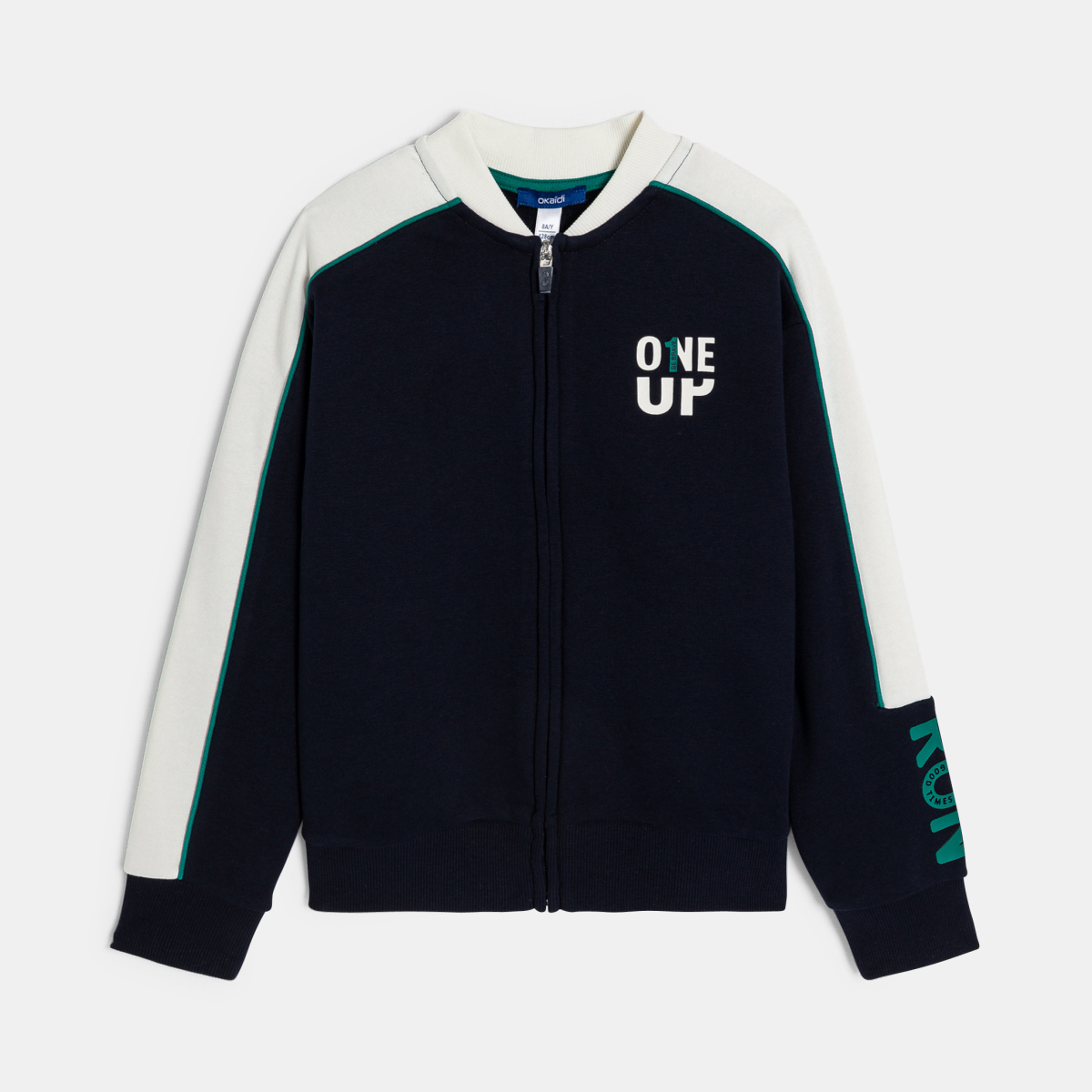 يرتديها الأولاد مغلقة بسحاب أو مفتوحة. مع بنطلون جينز أو بنطلون رياضي. هذا السويت شيرت من الميلتون ثنائي اللون المزين بالرسومات سيبرز بالتأكيد في أي مكان أو ملعب رياضي. رسالة مطبوعة على الصدر وعلى الكم. ياقة مستديرة مضلعة. الفتح بسحّاب. فتحات الذراعين على شكل مطرقة. أكمام طويلة. الحافة السفلية مستقيمة. الحواف مضلعة.