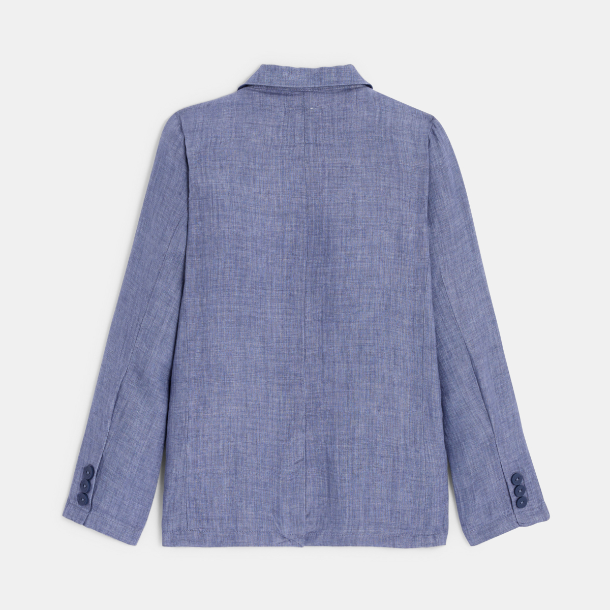 Description Chaque garçon se doit de posséder une belle veste de costume bleue. Ce modèle en coton et lin mélangés est personnalisé d'une broderie sur la poitrine. Coupe droite. Col tailleur. Fermeture 2 boutons. Manches longues bas de manches boutonnés. 2 poches à rabat. Base droite. Coutures ton sur ton.