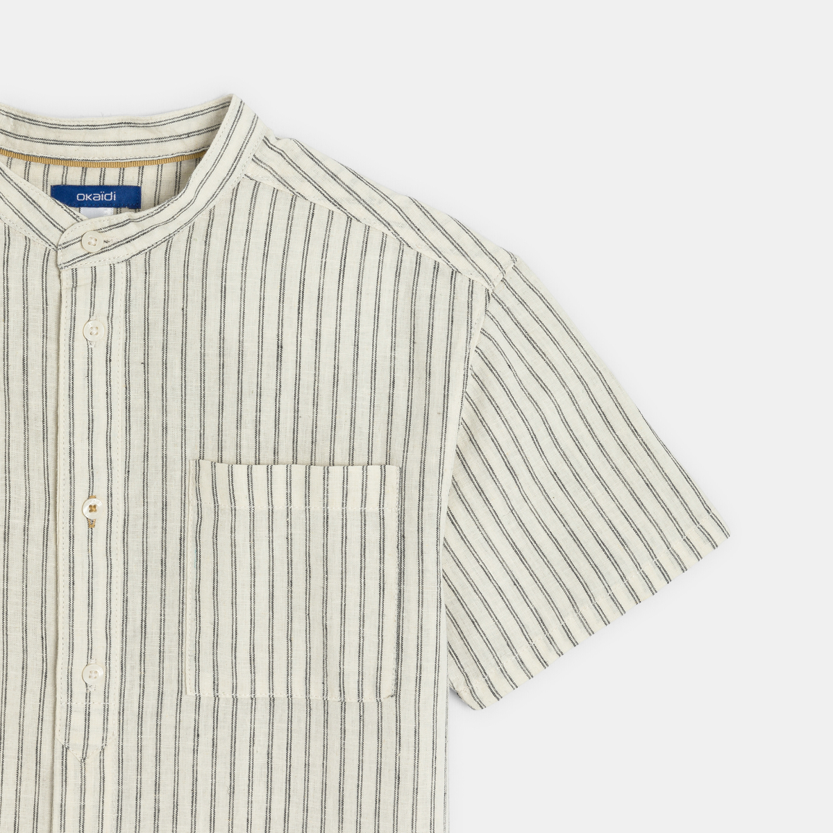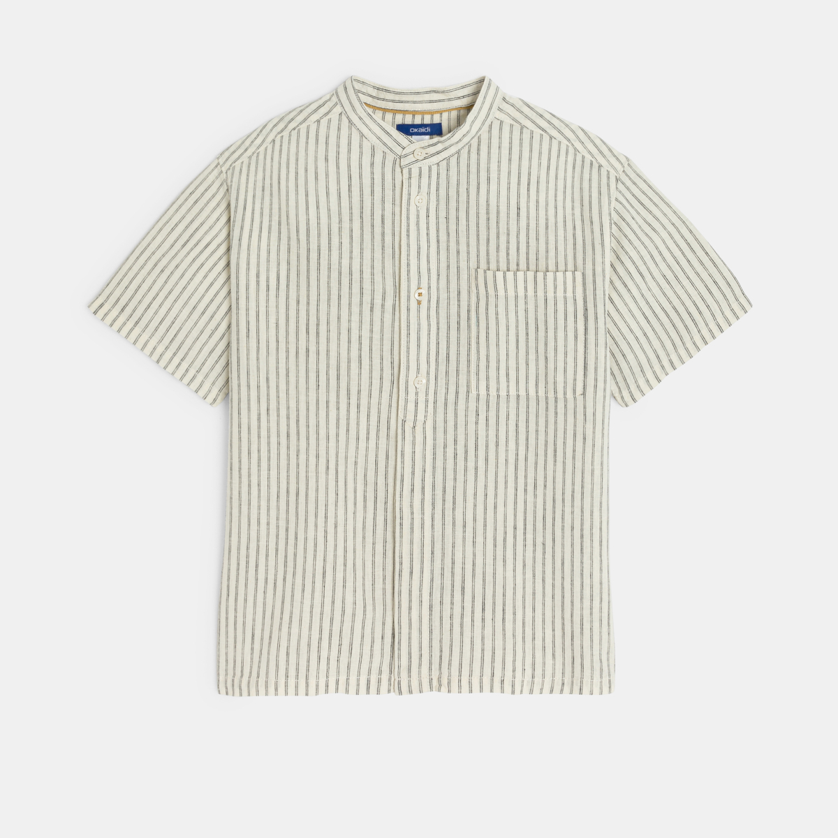 Le lin rayé c'est le cool qui rencontre le chic ! Exemple choisi avec cette chemisette à col Mao. Coupe droite. Col rond. Ouverture boutonnée. 1 poche poitrine. Manches courtes. Base droite. Coutures ton sur ton.
