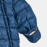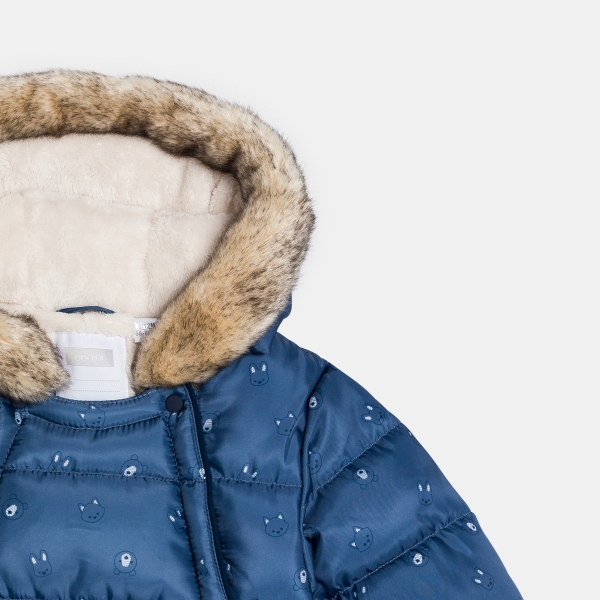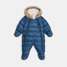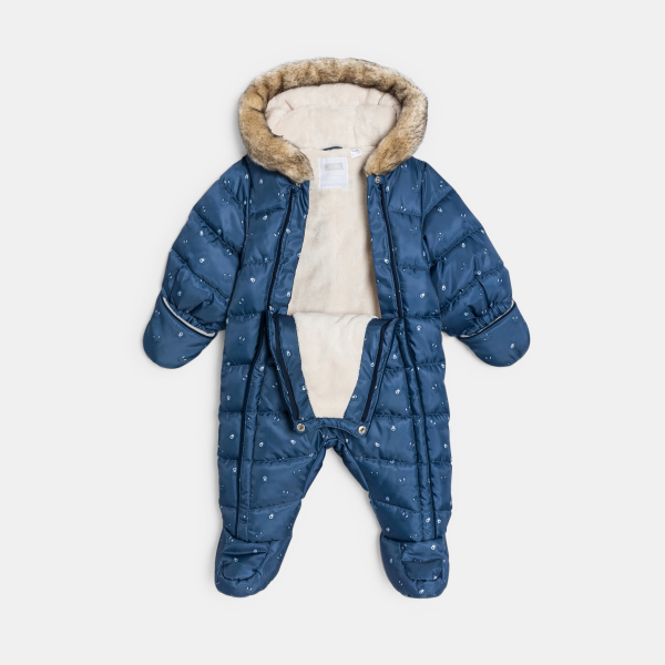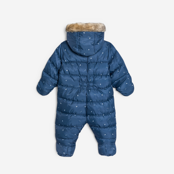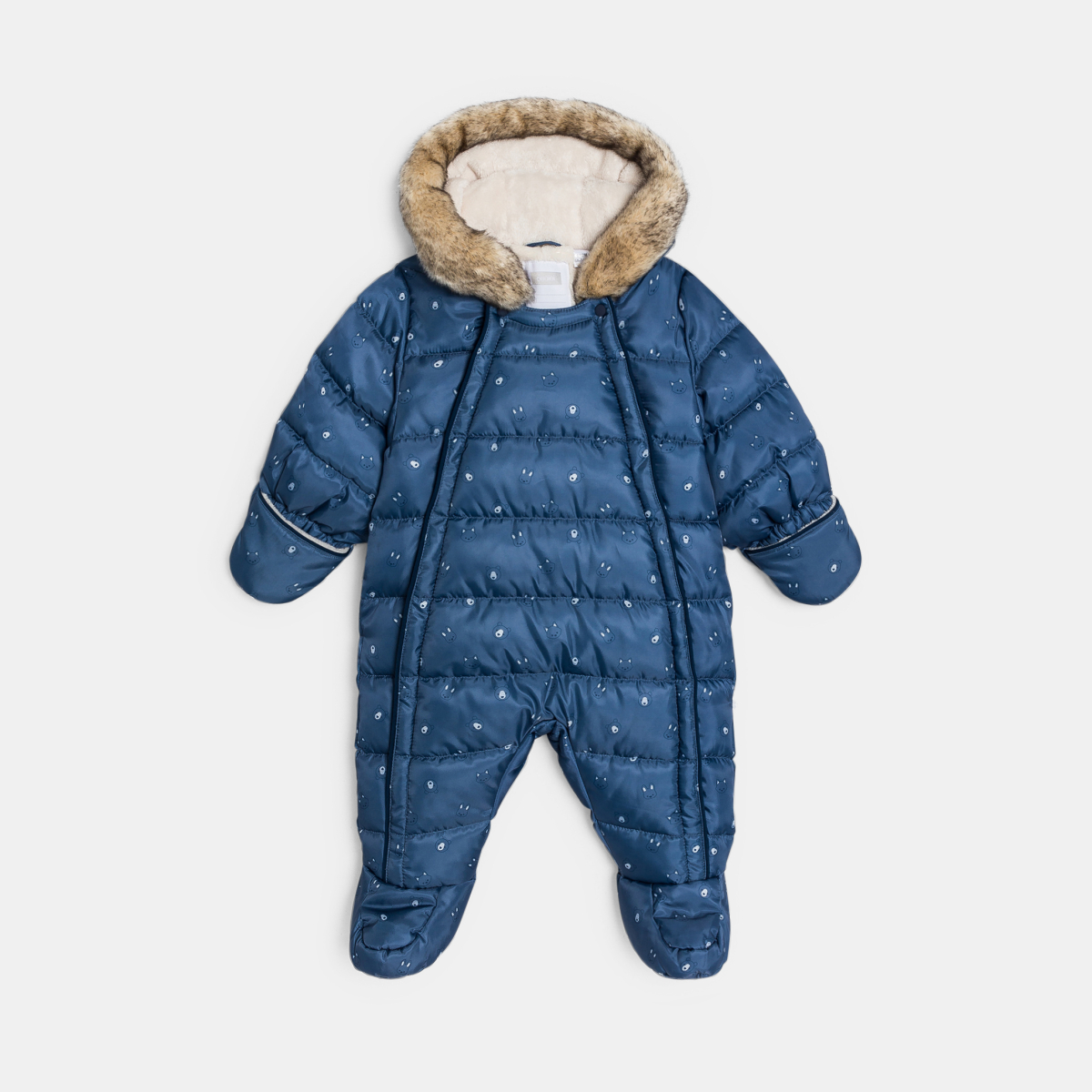 Chaleur et confort assurés avec cette combinaison bleue ! Confectionnée en tissu matelassé elle arbore un doux motif pour un style adorable. Capuche doublée de fausse fourrure pour une protection optimale. Fermeture zippée pratique longues manches et pieds intégrés. Parfaite pour les sorties hivernales elle offre un enfilage facile et un maintien douillet.nnToutes nos combinaisons pilotes disponibles jusquu2019au 23 mois sont pensées pour accompagner lu2019évolution de bébé : les modèles jusquu2019au 12 mois sont dotés de pieds et de moufles intégrés pour garder les tout-petits bien au chaud tandis que les versions du 18 mois au 23 mois sont sans pieds et avec moufles amovibles offrant ainsi plus de liberté de mouvement à mesure que bébé grandit.