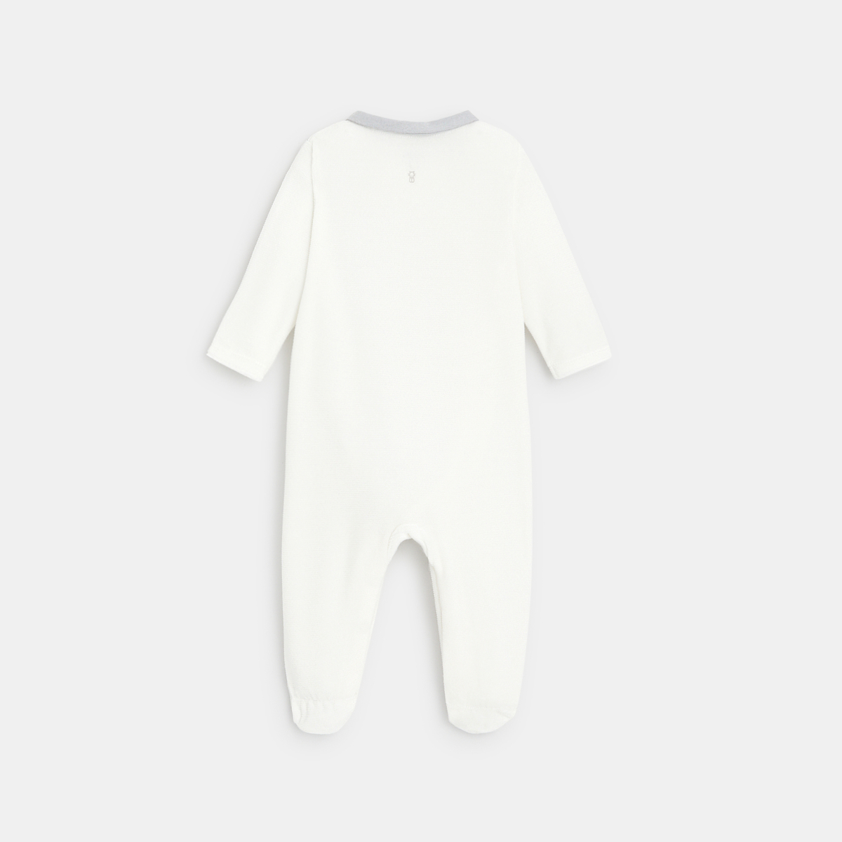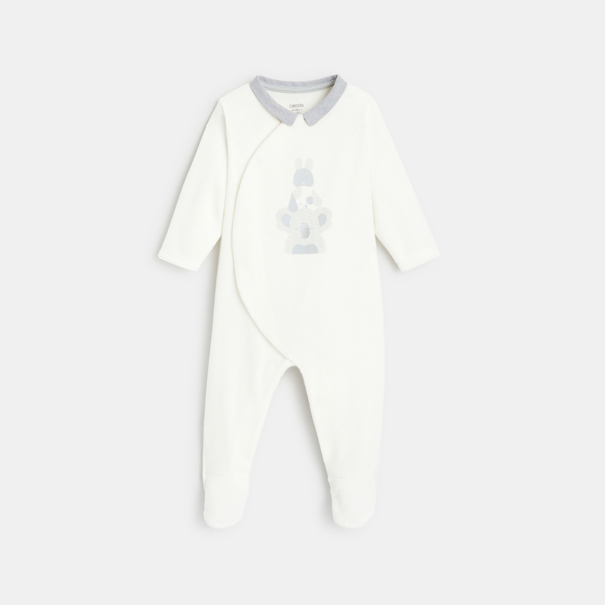 Description Trois petits amis se sont endormis sur ce dors-bien en velours légèrement côtelé. Détails en chambray sous les pieds et au col. Fermeture par pressions croisées devant pour habiller facilement les petits.