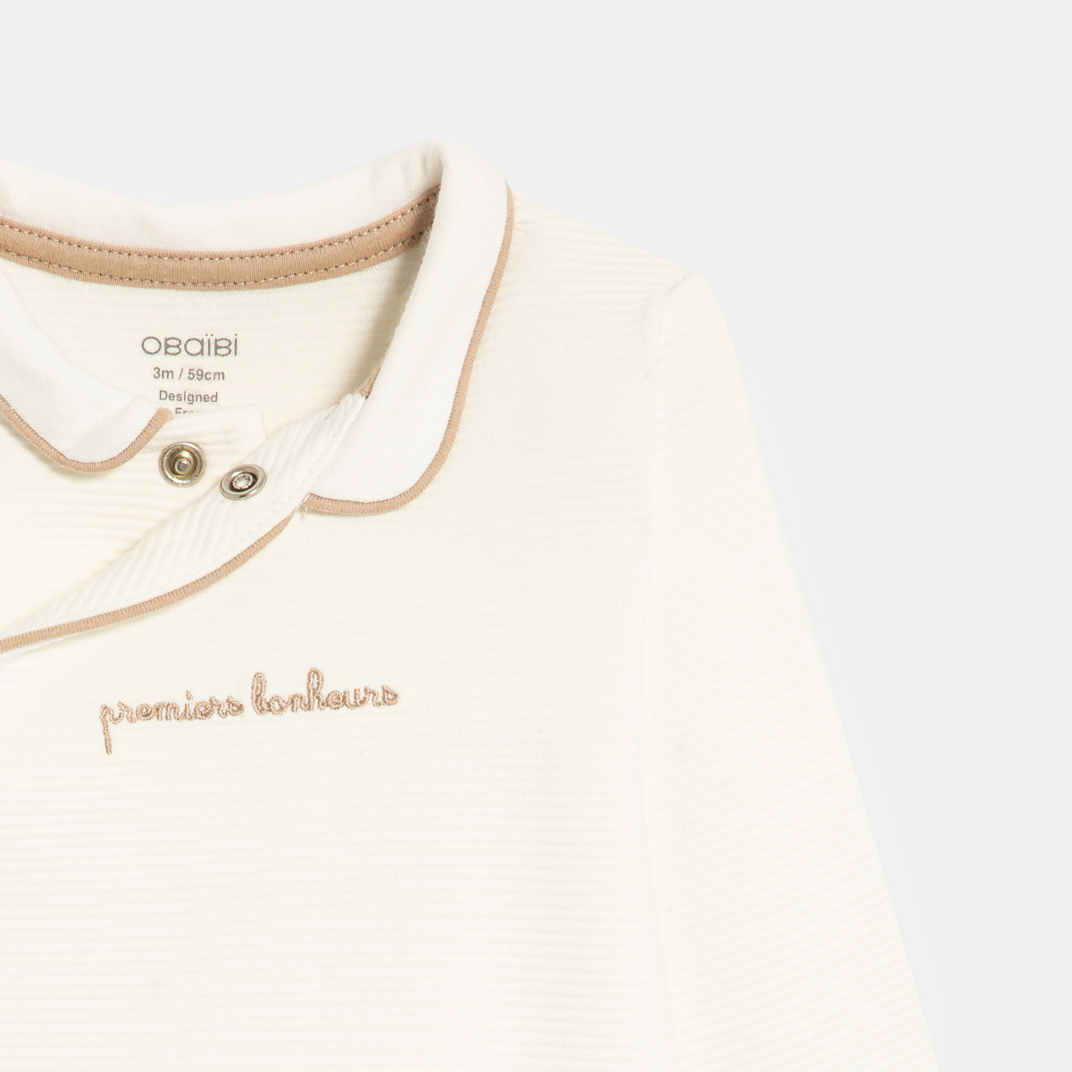 Dès les premiers jours des petits ce pyjama forme une pièce en coton fantaisie ajoute une touche chic dans le trousseau des enfants. On adore son effet côtelé son biais contrasté son petit col et sa broderie. Une forme pressionnée devant pour habiller les tout-petits sans trop les manipuler sur le dos.