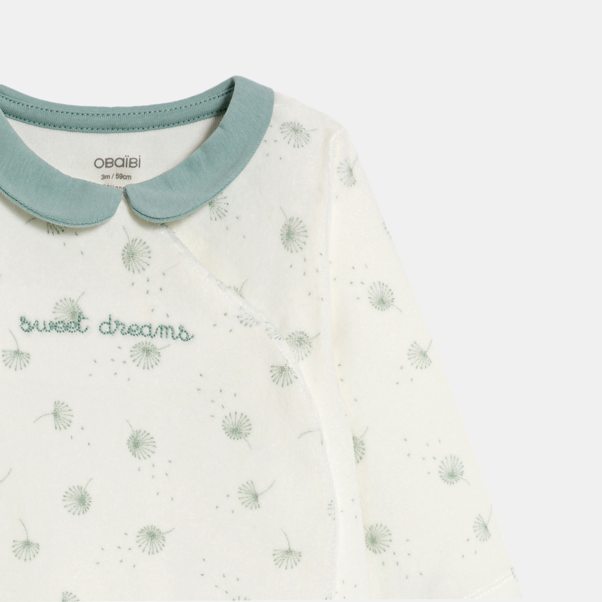 Illustré d'aigrettes de pissenlits stylisées, ce pyjama forme une pièce est un indispensable du dressing des filles, dès les premiers jours. En velours doux, moelleux et chaud, il entoure les petites de son confort. Ouverture croisée devant par pressions pour un habillage facile.