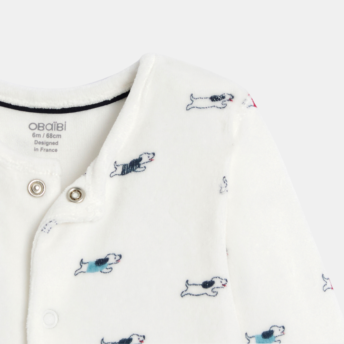 Description Indispensable dans le trousseau des petits dès les premiers jours ce lot de deux pyjamas forme une pièce en velours doux assure confort et chaleur aux garçons. Un modèle uni à pressions dos et pont et un modèle imprimé ouvert devant.