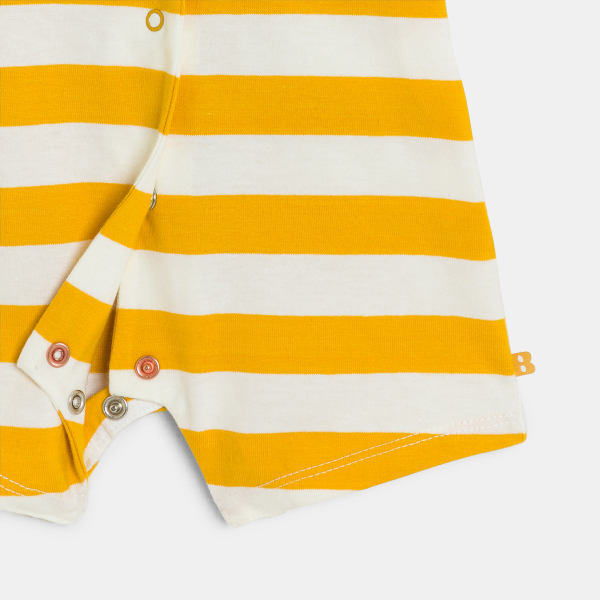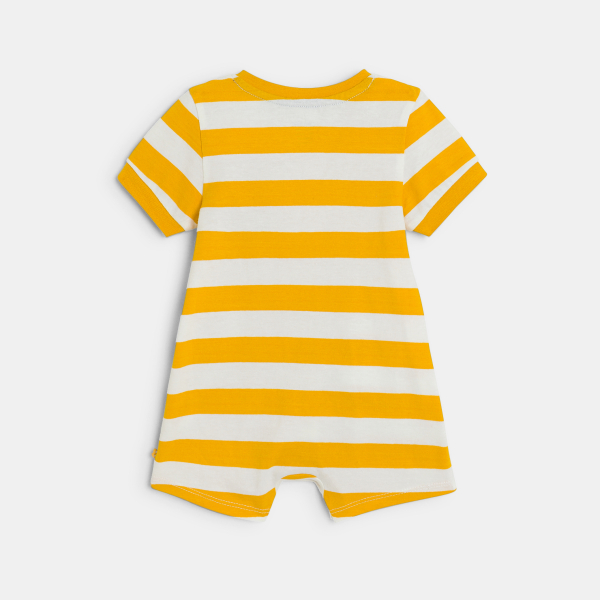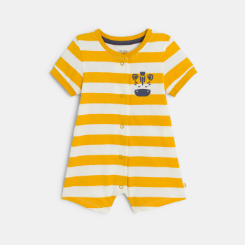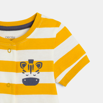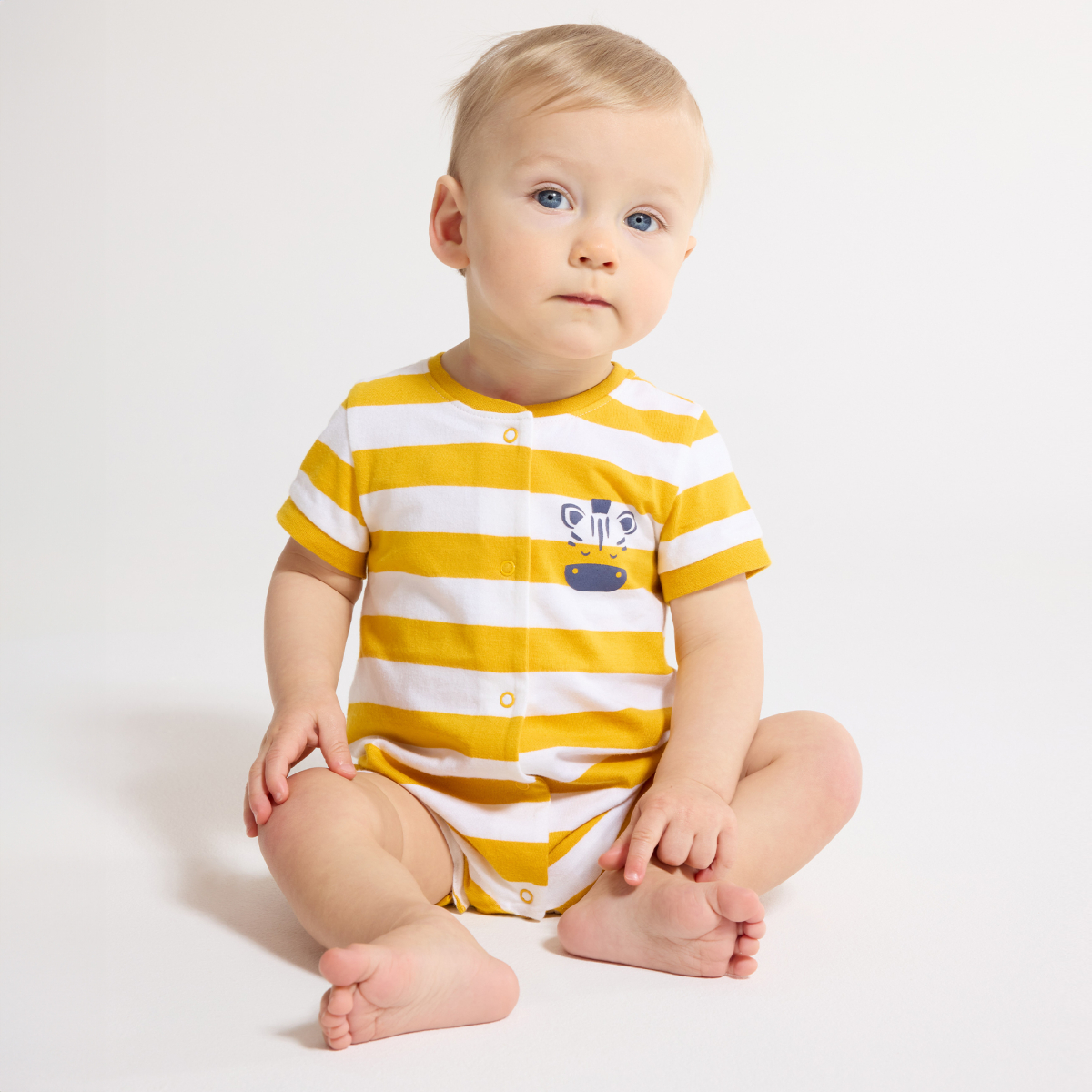 Description Une touche lumineuse dans le vestiaire des garçons ! Avec cette combinaison rayée, le quotidien des petits est rayonnant ! Imprimée d'une tête de zèbre, cette combi pressionnée les entoure de douceur. Une forme manches et jambes courtes essentielle quand il fait chaud !