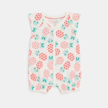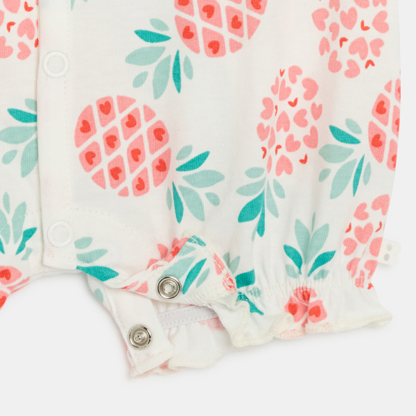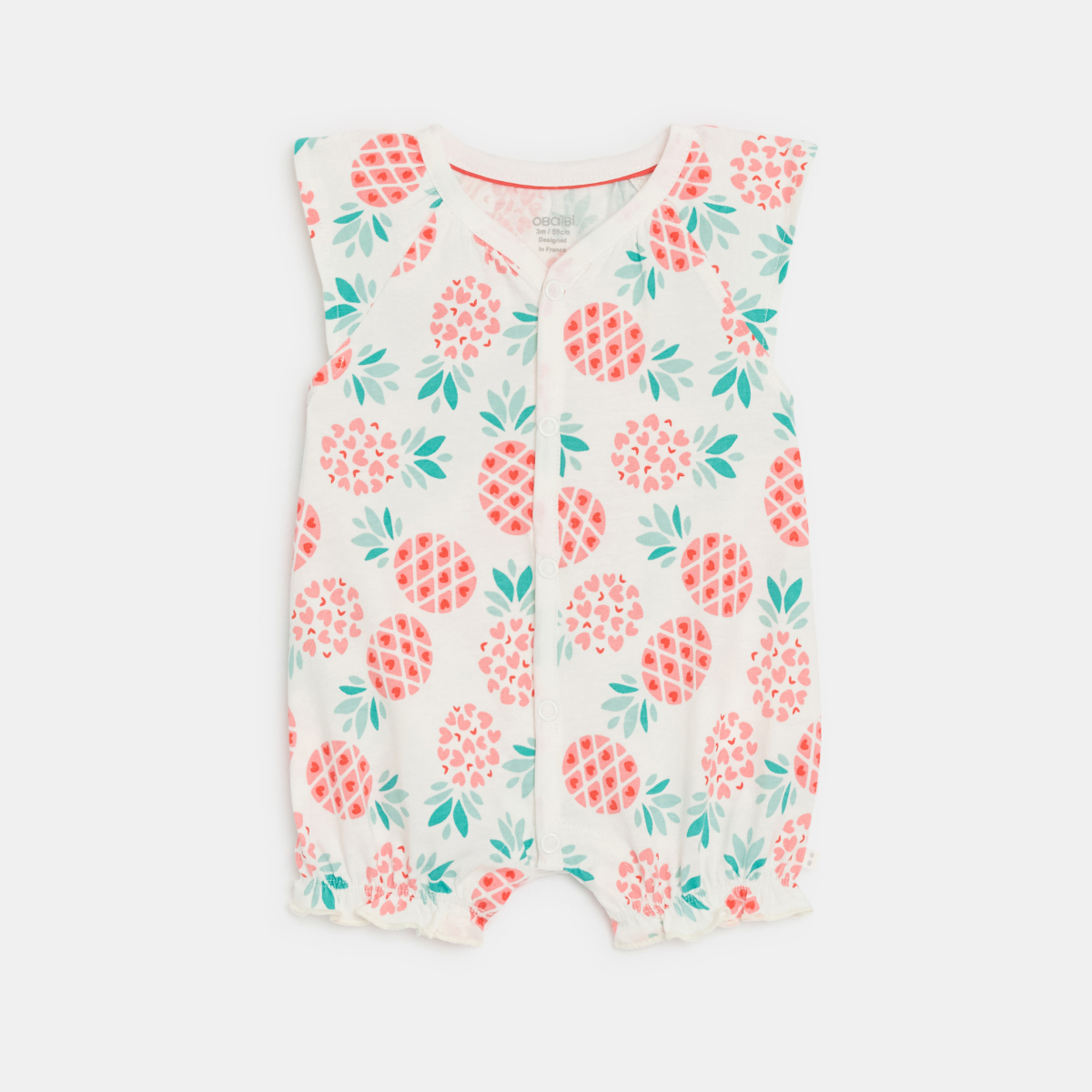Pour les journées chaudes des filles, cette combinaison courte à l'illustration gourmande est idéale : petites manches courtes volantées et cuisses élastiquées pour un confort maximal. Et pour un habillage facile des petites, ouverture devant par pressions.