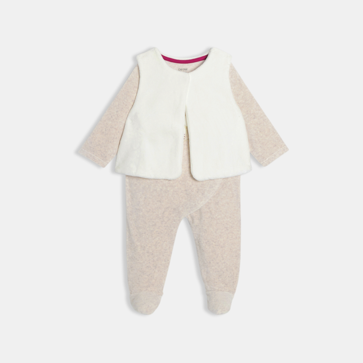 Pour entourer les petites de douceur et de confort dès les premiers jours, cet ensemble en velours moelleux est essentiel. Le pyjama forme une pièce s'ouvre par pressions sur le devant pour éviter un maximum de manipulation. Le gilet assorti réchauffe les filles. Un joli cadeau de naissance à offrir !
