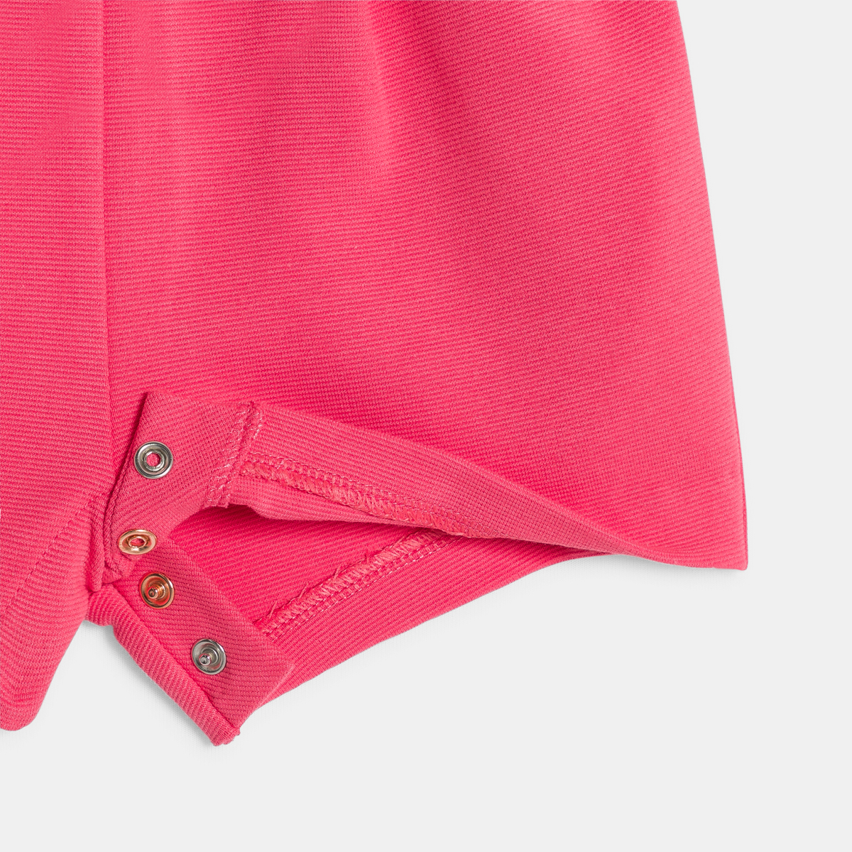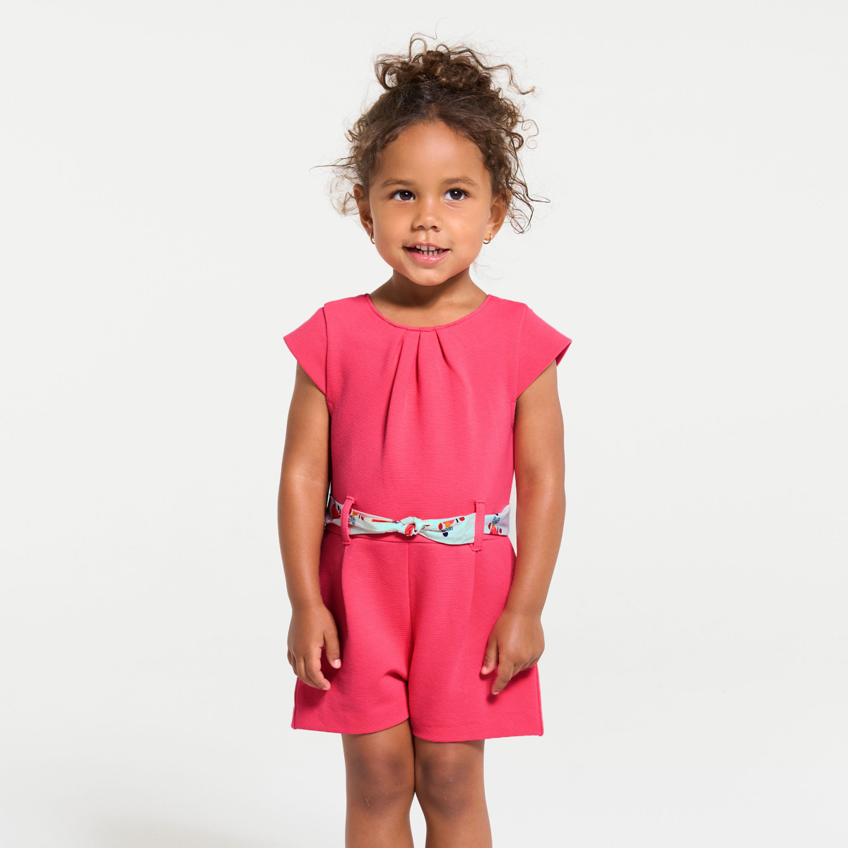 Souple et tout confort cette combi courte en coton fantaisie est indispensable dans le dressing des filles. Avec ses détails chics elle a tout bon : petites manches jeux de plis à l'encolure et à la taille et ceinture fleurie contrastée. Pour habiller facilement les petites pressions au dos.