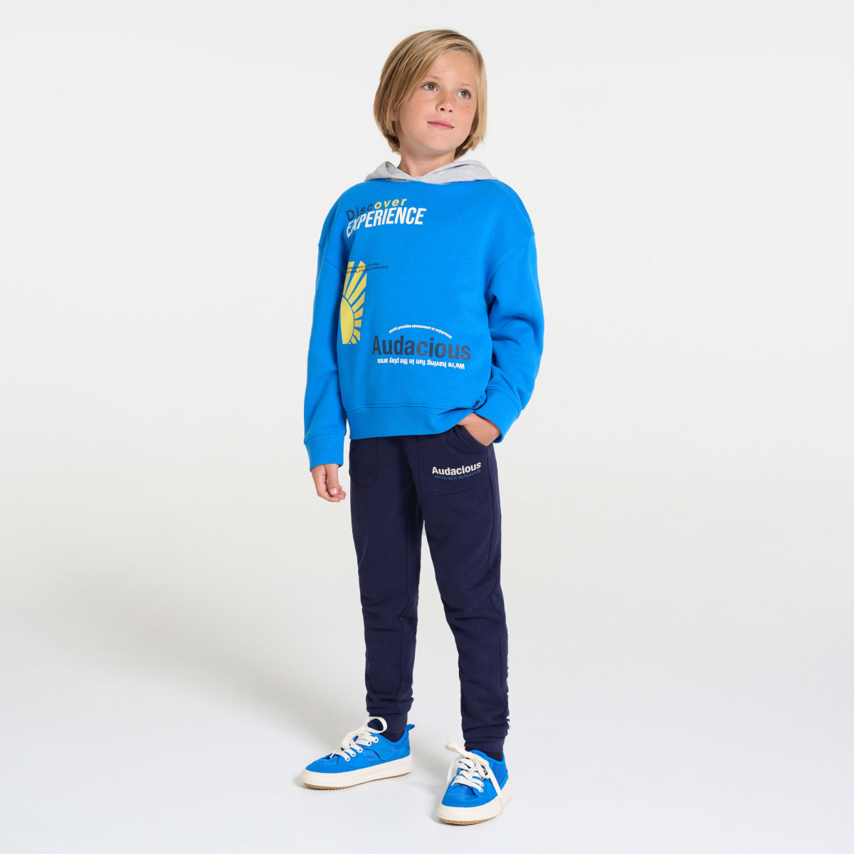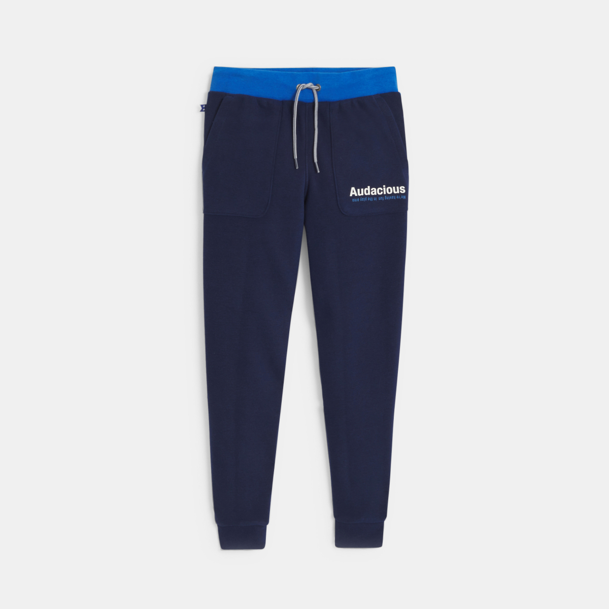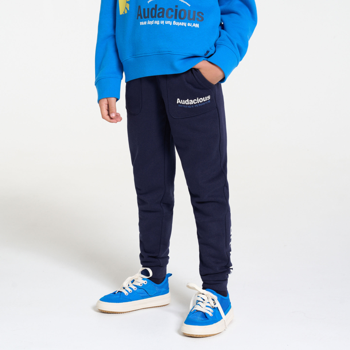 Sportif et confort. Cocoon et cool. Les garçons savent bien que ce jogging est prêt à suivre leur rythme imposé ! Molleton doux. Coupe jogging avec bas de jambes côtelés. Taille élastiquée côtelée, ajustable, cordon à nouer. 2 poches. Texte imprimé devant en détail.