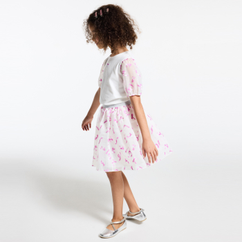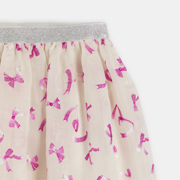 Air de fête et belle légèreté : cette jupe patineuse est dédiée aux filles qui aiment danser ! Voile doublé motifs brodés. Coupe évasée. Taille élastiquée pailletée. Doublure. Base arrondie.n
