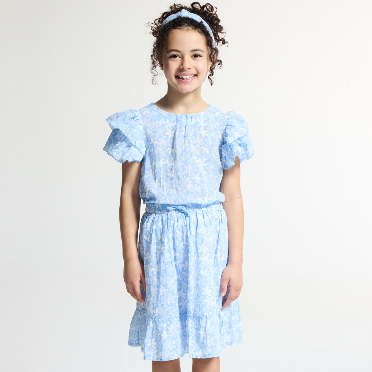 Légèreté et poésie dans l'air : cette jupe imprimée de fleurs fait danser les filles avec sa coupe évasée et sa base volantée ! Taille élastiquée, ruban à nouer. Finition piquée.
