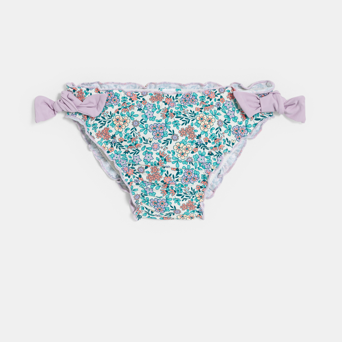 Coordonné au t-shirt anti UV, le slip de bain se pare de fleurs pour les vacances des petites filles. Une jolie finition bourdon colorée et des noeuds sur les côtés pour les coquettes.