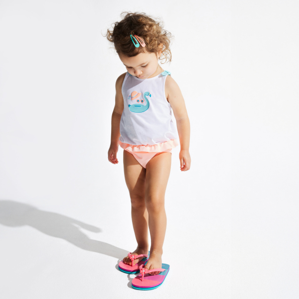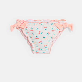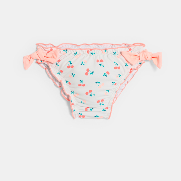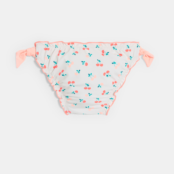 Coordonné au t-shirt anti UV, le slip de bain se pare de fleurs pour les vacances des petites filles. Une jolie finition bourdon colorée et des noeuds sur les côtés pour les coquettes.