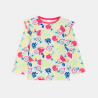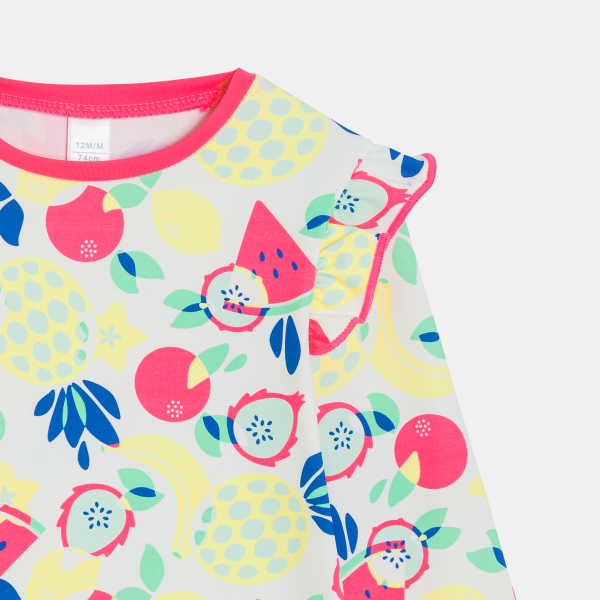 Pour protéger la peau des vacancières, ce tee-shirt anti UV +50 assure un excellent rempart contre les UVA et UVB, en complément des mesures de bases (crème solaire, chapeau et lunettes de soleil). Les petites adorent son imprimé gourmand et ses volants aux épaules !