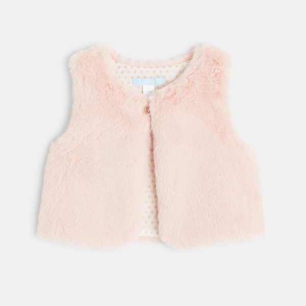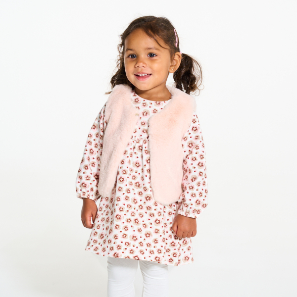 En fausse fourrure hyper douce une forme gilet sans manches qui réchauffe tous les looks des filles. Intérieur print all-over floral. Fermeture par une pression.