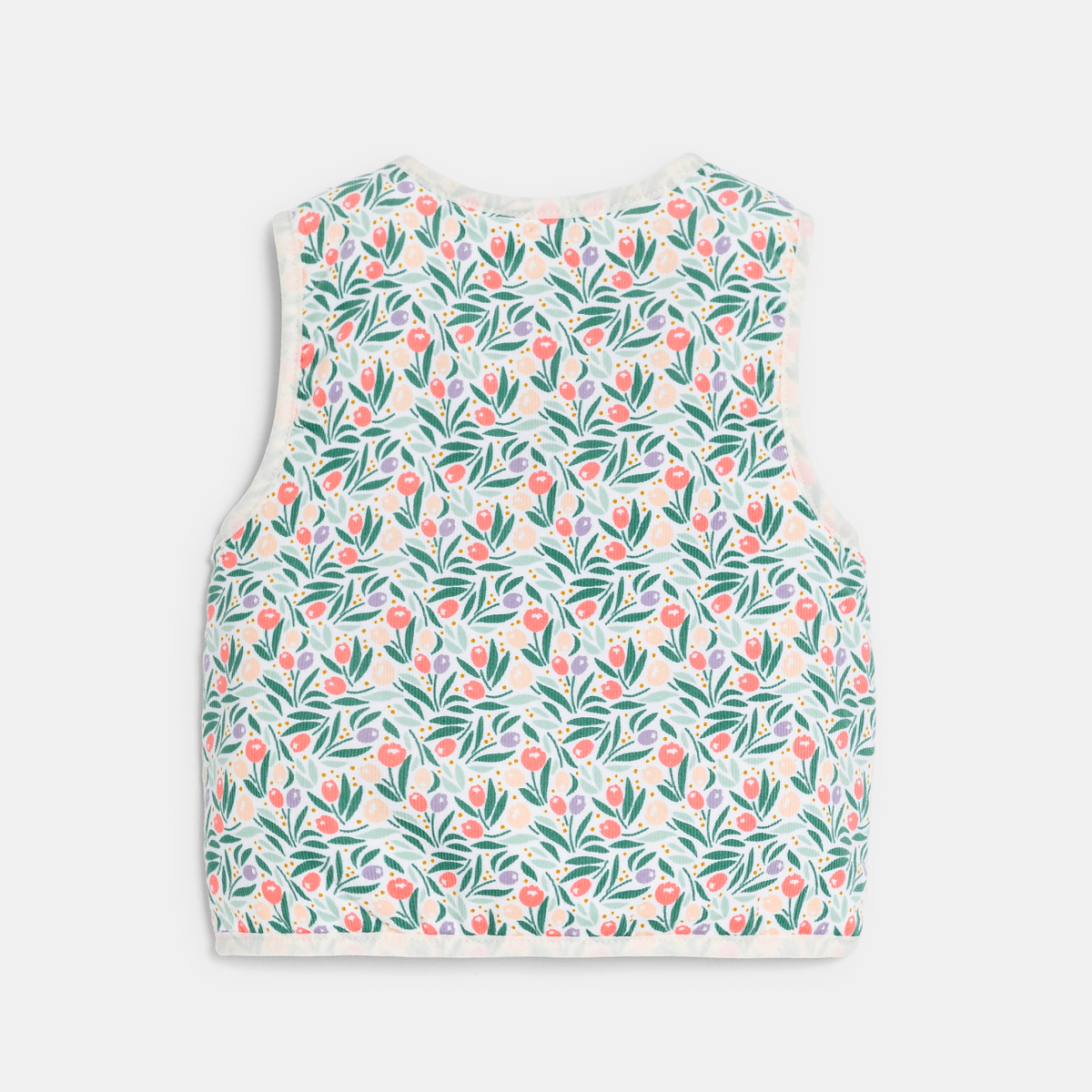 Description Pour avoir chaud en toute circonstance, ce gilet sans manches se porte seul ou sous un manteau. Réversible pour deux fois plus de style, on aime son recto en velours fleuri et son verso uni moutonné. Fermeture par pressions pour habiller facilement les filles.