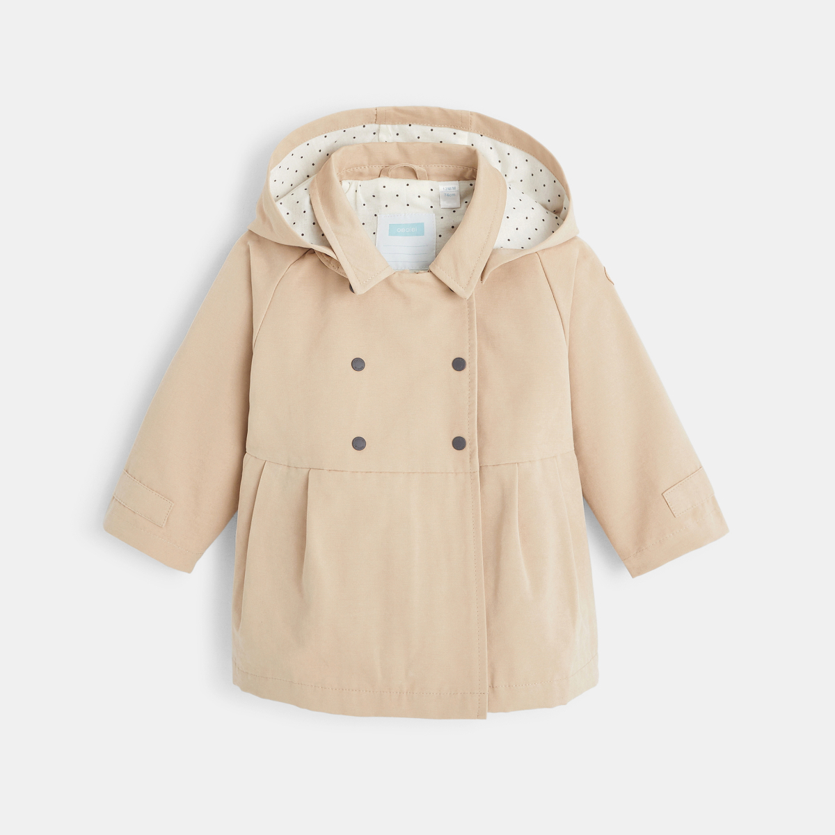 Le petit manteau imperméable à capuche amovible chic et pratique parfait pour le printemps. Une toile unie émerisée toute douce et déperlante doublée de jersey imprimé sur une forme zippée sous pressions pratique. 2 poches sous la découpe taille.