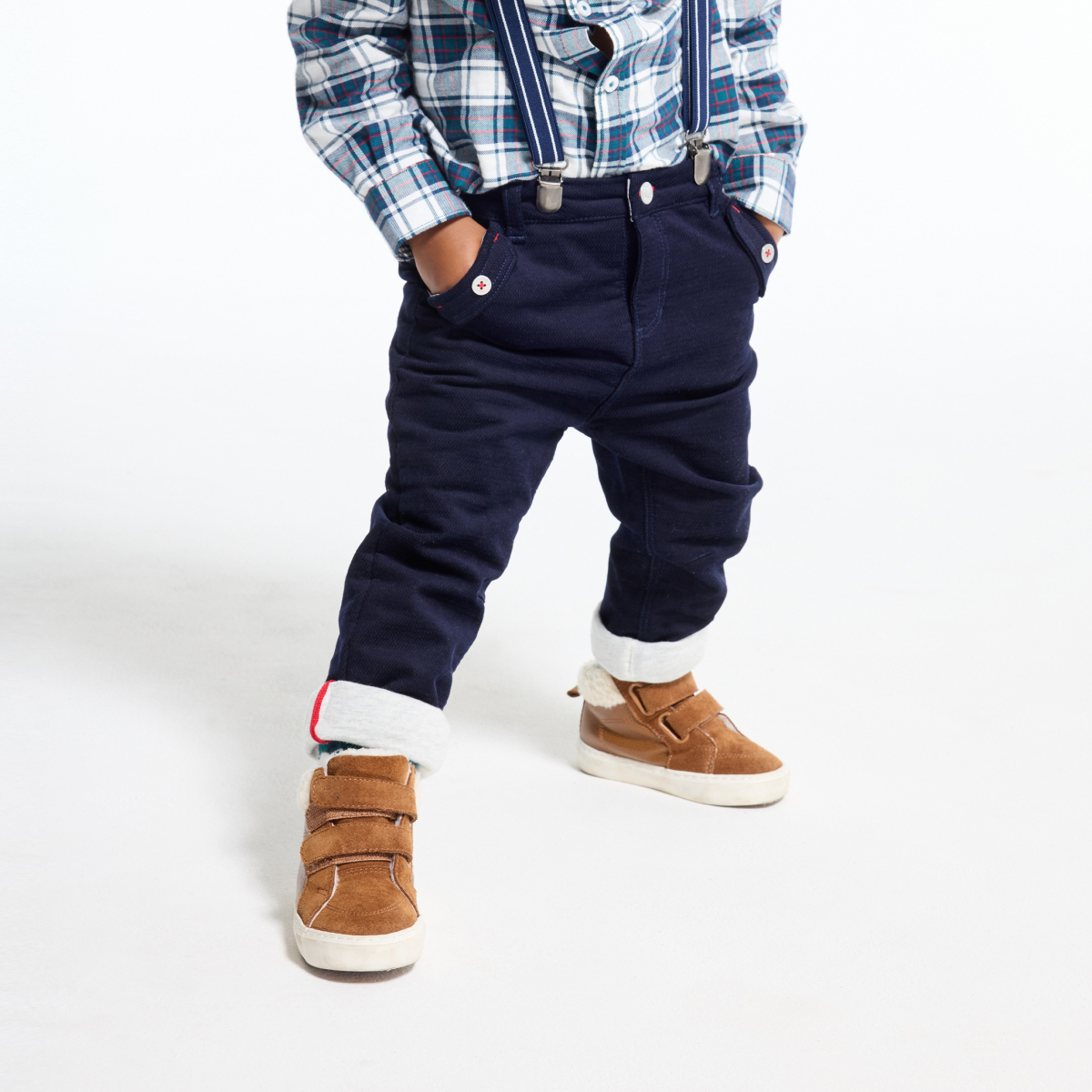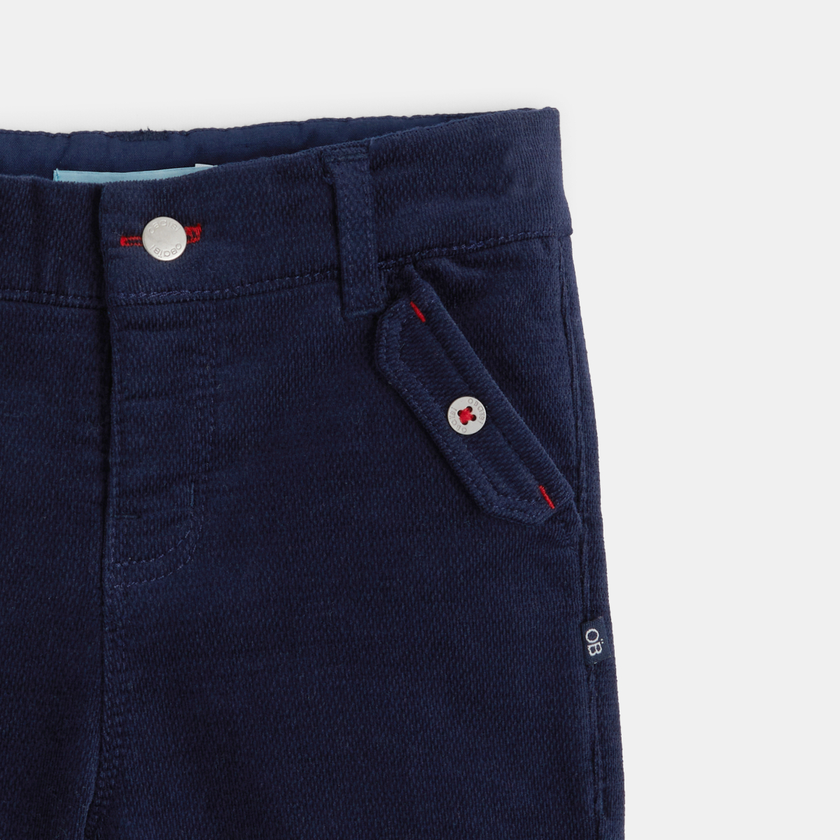 Un look citadin et moderne pour le pantalon velours des petits garçons. Ses détails qui en font la vedette de cet hiver ? Un velours fantaisie revisité des revers chinés et des finitions rouges.