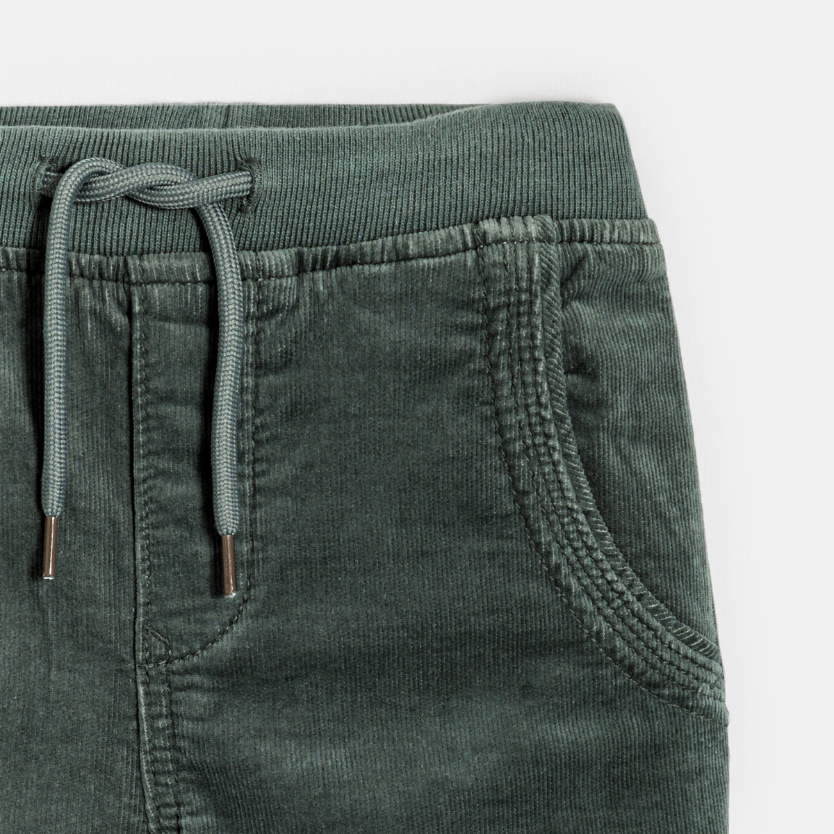 Jouer. Se balader. Voyager. Ce pantalon jogpant en velours vert kaki fait partie des bons choix à faire pour composer des bons looks garçons. Velours finement côtelé. Coupe jogging. Taille côtelée élastiquée ajustable, cordon à nouer. 2 poches italiennes. Bas de jambes côtelés.