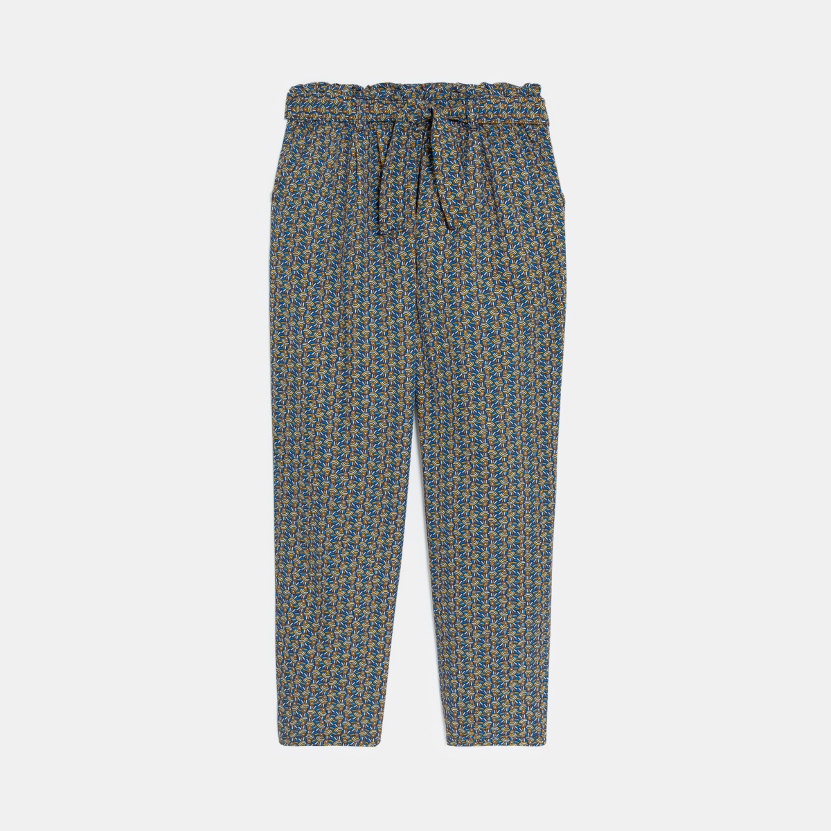 La belle saison est une invitation à aimer ce pantalon kaki doux et fluide tout confort avec sa taille paper bag élastiquée. Motifs imprimés all over. Passants. Ceinture à nouer (amovible). 2 poches.