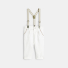 Incontournable pour les évènements chics ce pantalon élégant à pinces habille les garçons comme les grands ! Bretelles rayées amovibles. Biais contrasté aux poches.