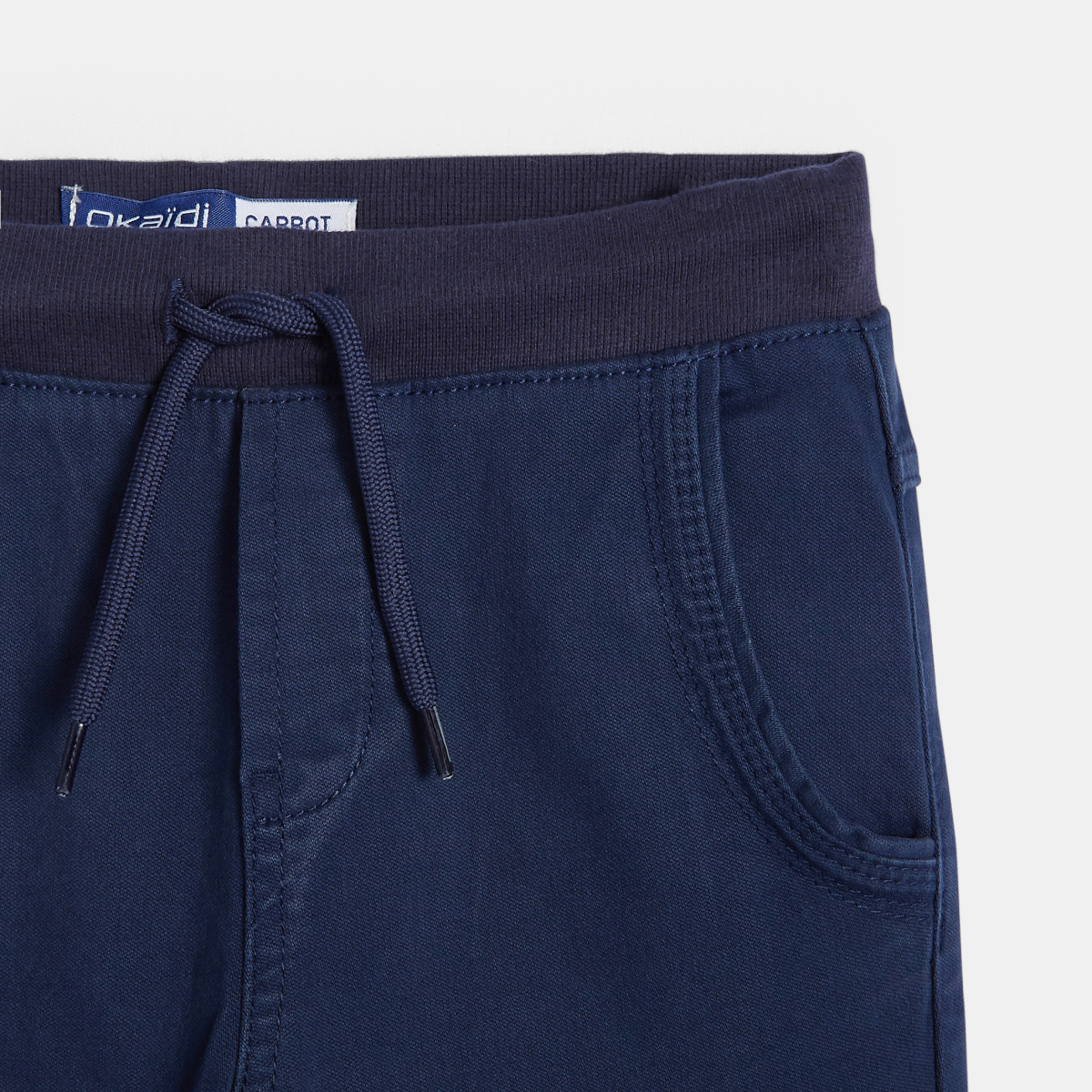 Belle liberté de mouvement ! Sur ce pantalon 4 poches en toile stretch tout confort, la coupe carrot ressemble à un jogging. La taille côtelée se resserre via un cordon à nouer et un élastique boutonné à l'intérieur.